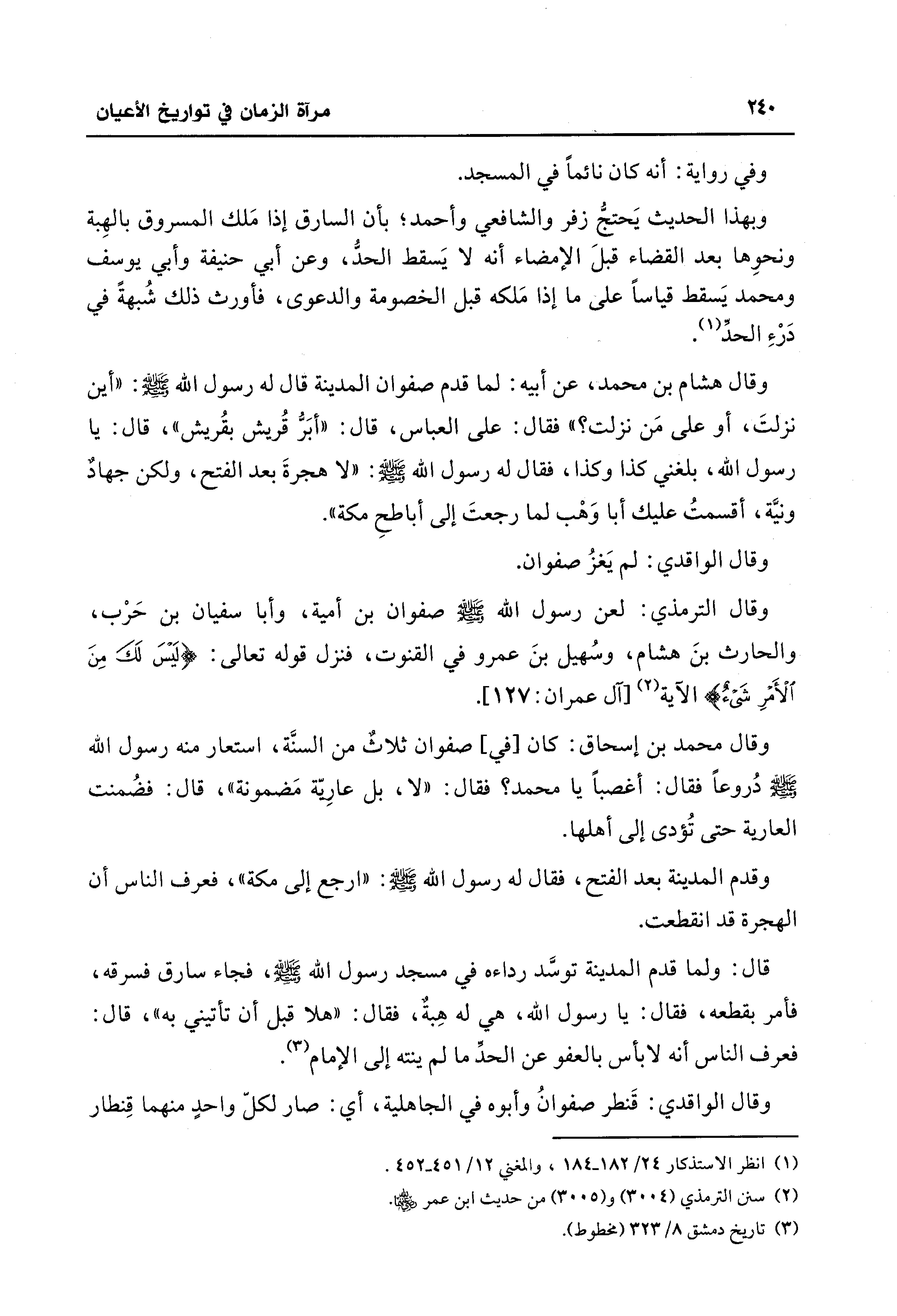 قال: ولما قدم المدينة توسَّد رداءه في مسجد رسول الله - صلى الله عليه وسلم -، فجاء سارق فسرقه، فأمر بقطعه، فقال: يا رسول الله، هي له هِبةٌ، فقال: "هلا قبل أن تأتيني به"، قال: فعرف الناس أنه لا بأس بالعفو عن الحدّ ما لم ينته إلى الإمام (¬3).