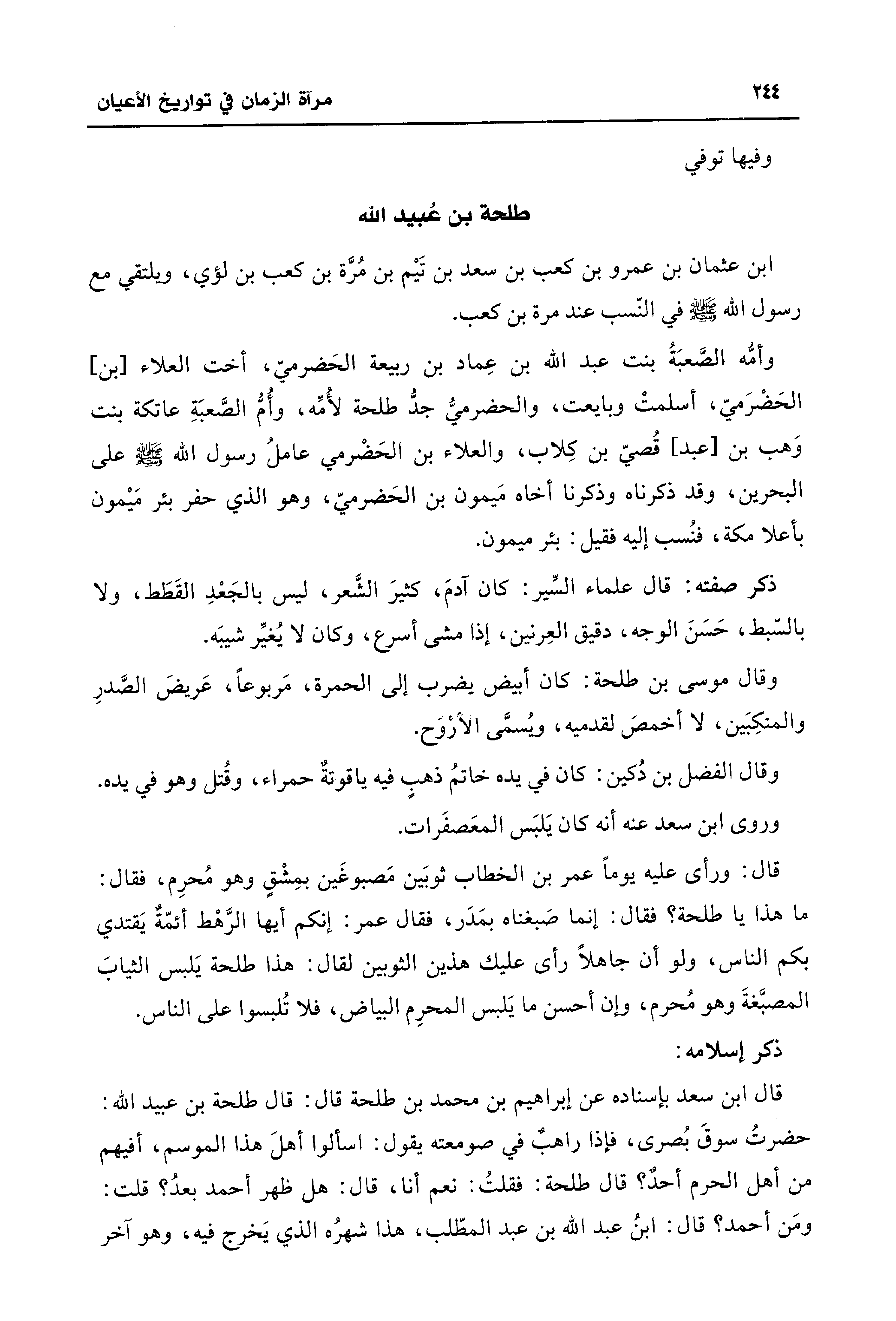 قال: ورأى عليه يومًا عمر بن الخطاب ثوبَين مَصبوغَين بمِشْقٍ وهو مُحرِم، فقال: ما هذا يا طلحة؟ فقال: إنما صَبغناه بمَدَر، فقال عمر: إنكم أيها الرَّهْط أئمّة يَقتدي بكم الناس، ولو أن جاهلًا رأى عليك هذين الثوبين لقال: هذا طلحة يَلبس الثيابَ المصبَّغةَ وهو مُحرم، وإن أحسن ما يَلبس المحرِم البياض، فلا تُلبسوا على الناس.
