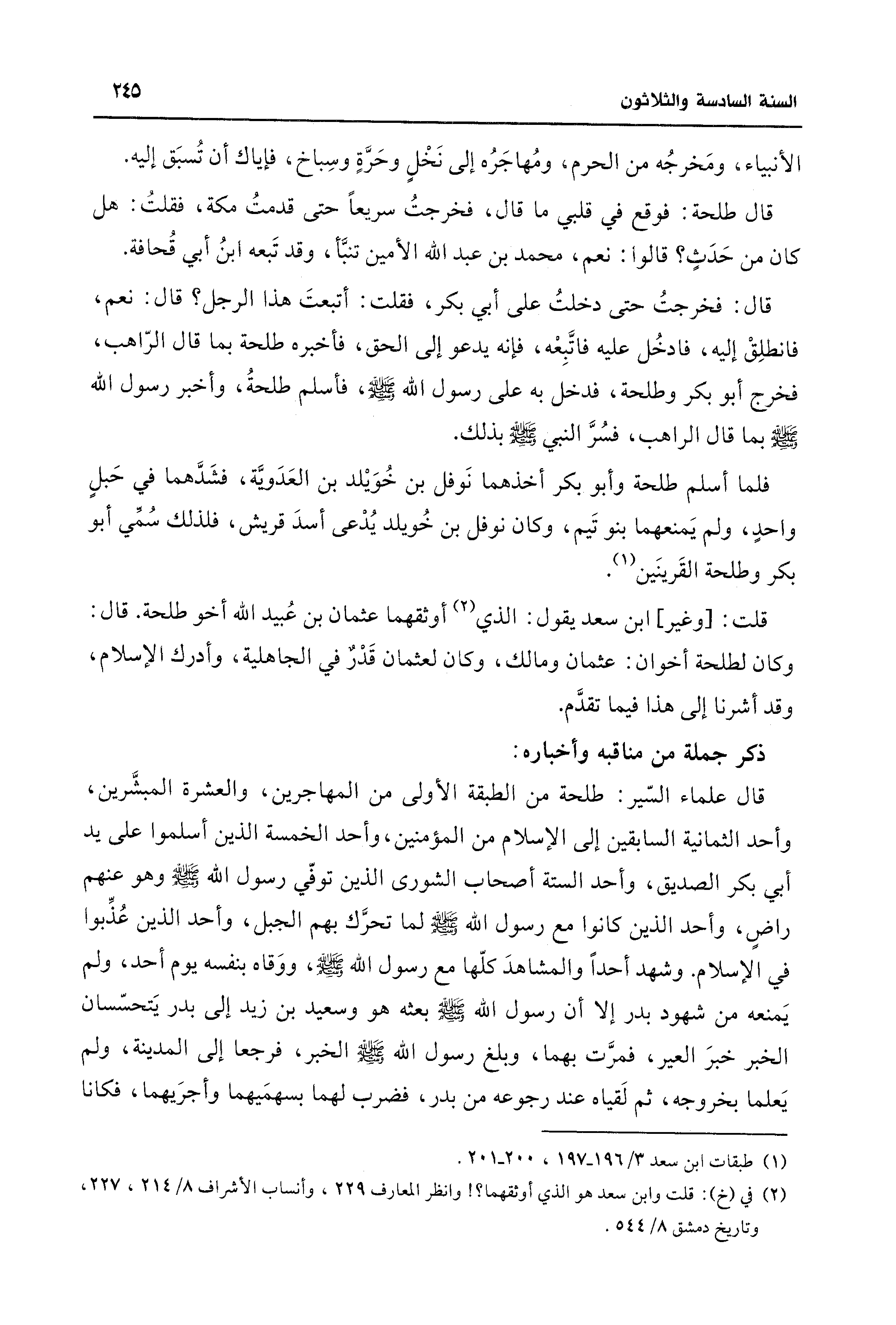 قال: فخرجتُ حتى دخلتُ على أبي بكر، فقلت: أتبعتَ هذا الرجل؟ قال: نعم، فانطلِقْ إليه، فادخُل عليه فاتَّبِعْه، فإنه يدعو إلى الحق، فأخبره طلحة بما قال الرّاهب، فخرج أبو بكر وطلحة، فدخل به على رسول الله - صلى الله عليه وسلم -، فأسلم طلحةُ، وأخبر رسول الله - صلى الله عليه وسلم - بما قال الراهب، فسُرَّ النبي - صلى الله عليه وسلم - بذلك.
