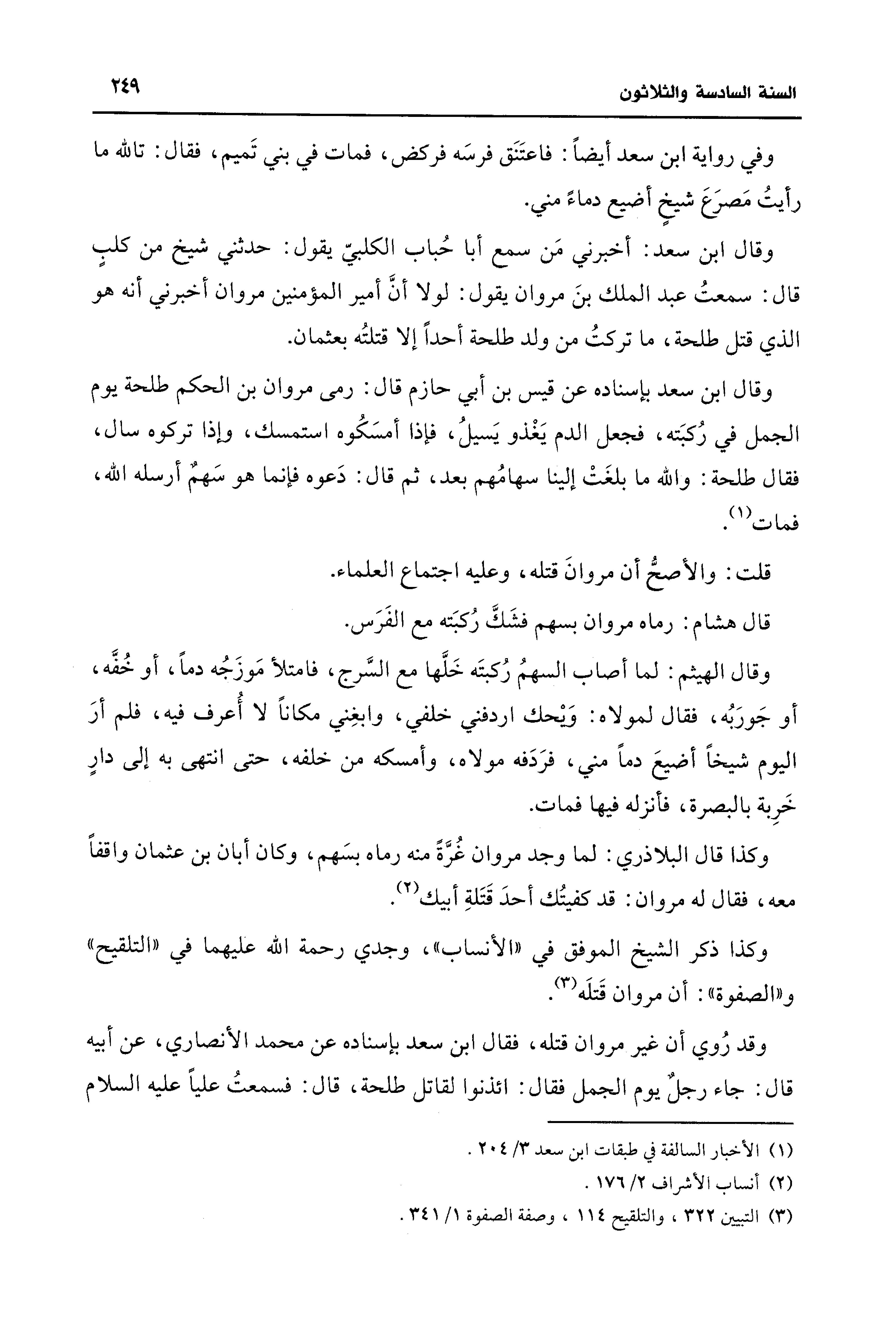 وقد رُوي أن غير مروان قتله، فقال ابن سعد بإسناده عن محمد الأنصاري، عن أبيه قال: جاء رجلٌ يوم الجمل فقال: ائذنوا لقاتل طلحة، قال: فسمعتُ عليًّا - عليه السلام -