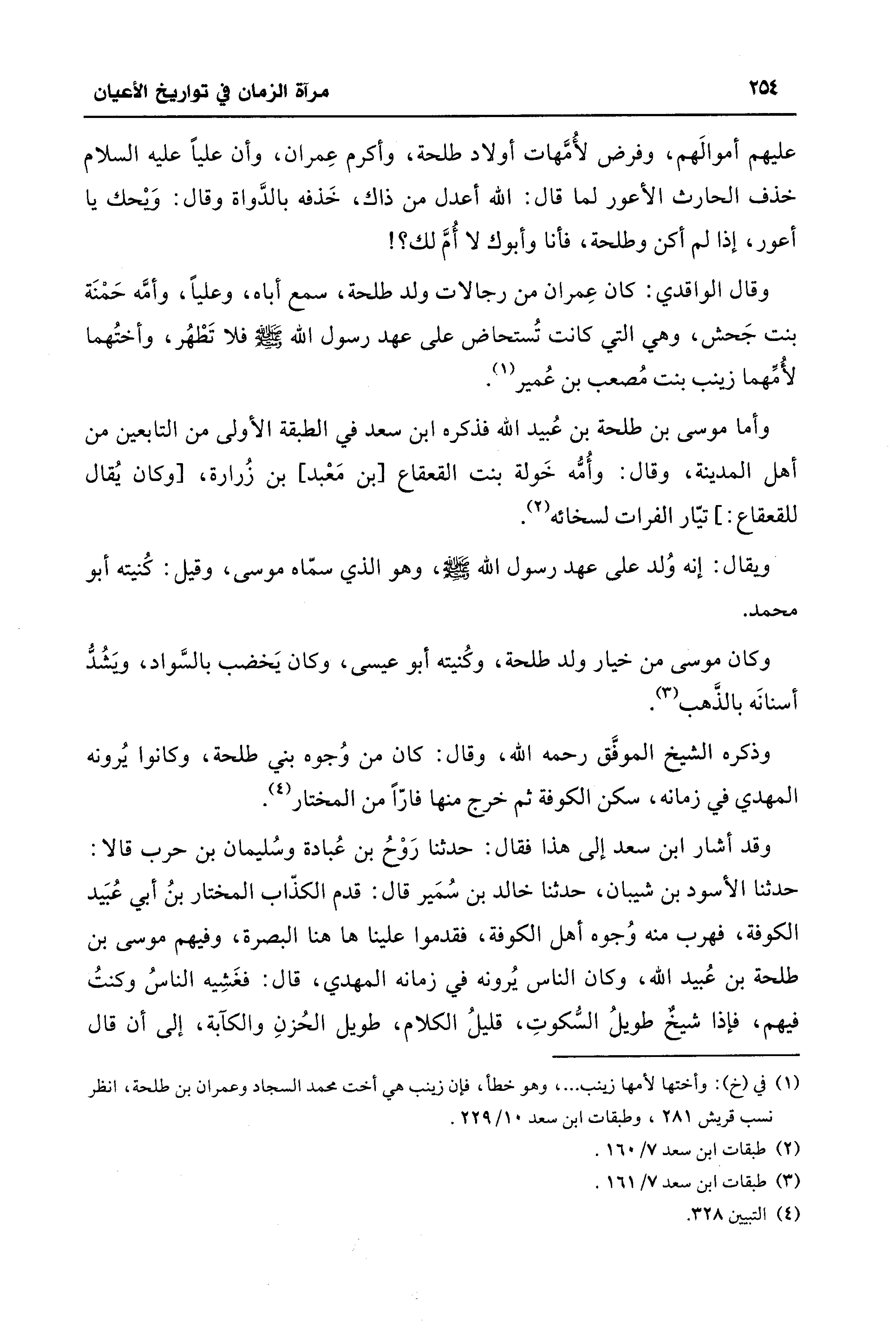 وذكره الشيخ الموفَّق رحمه الله، وقال: كان من وُجوه بني طلحة، وكانوا يُرونه المهدي في زمانه، سكن الكوفة ثم خرج منها فارًّا من المختار (¬4).