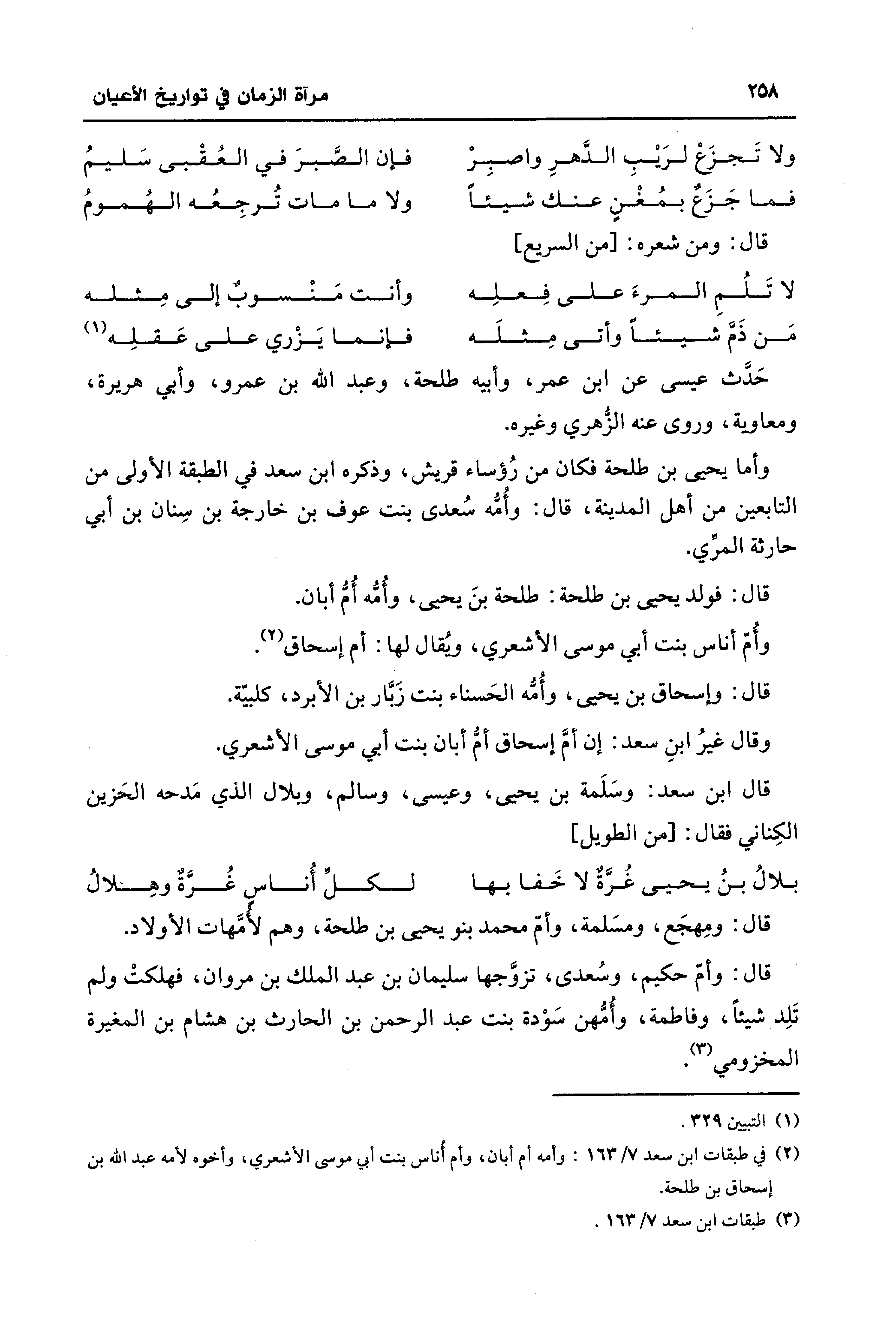 وأما يحيى بن طلحة فكان من رُؤساء قريش، وذكره ابن سعد في الطبقة الأولى من التابعين من أهل المدينة، قال: وأُمُّه سُعدى بنت عوف بن خارجة بن سِنان بن أبي حارثة المرِّي.