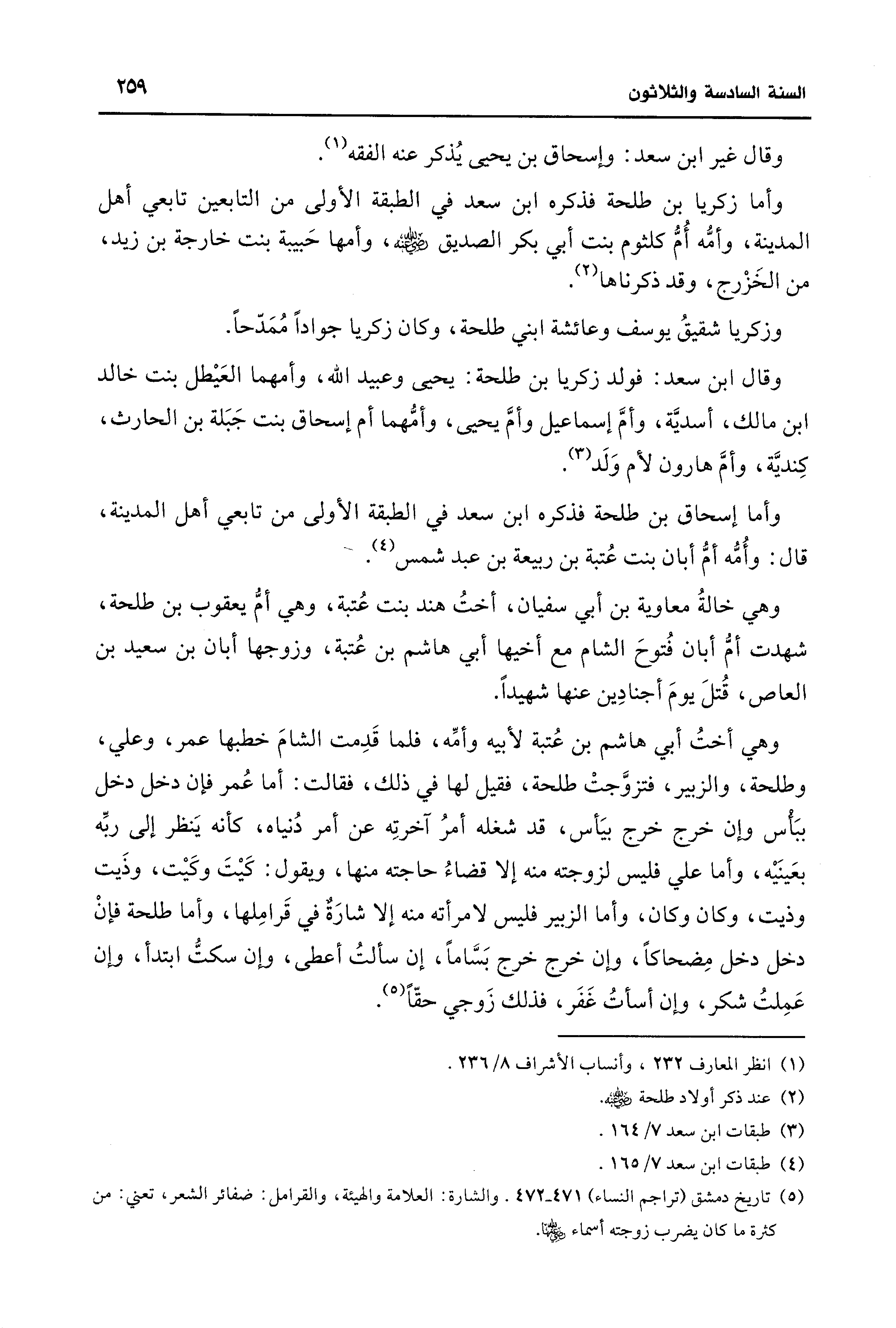 وأما زكريا بن طلحة فذكره ابن سعد في الطبقة الأولى من التابعين تابعي أهل المدينة، وأمُّه أُمُّ كلثوم بنت أبي بكر الصديق - رضي الله عنه -، وأمها حَبيبة بنت خارجة بن زيد، من الخَزرج، وقد ذكرناها (¬2).