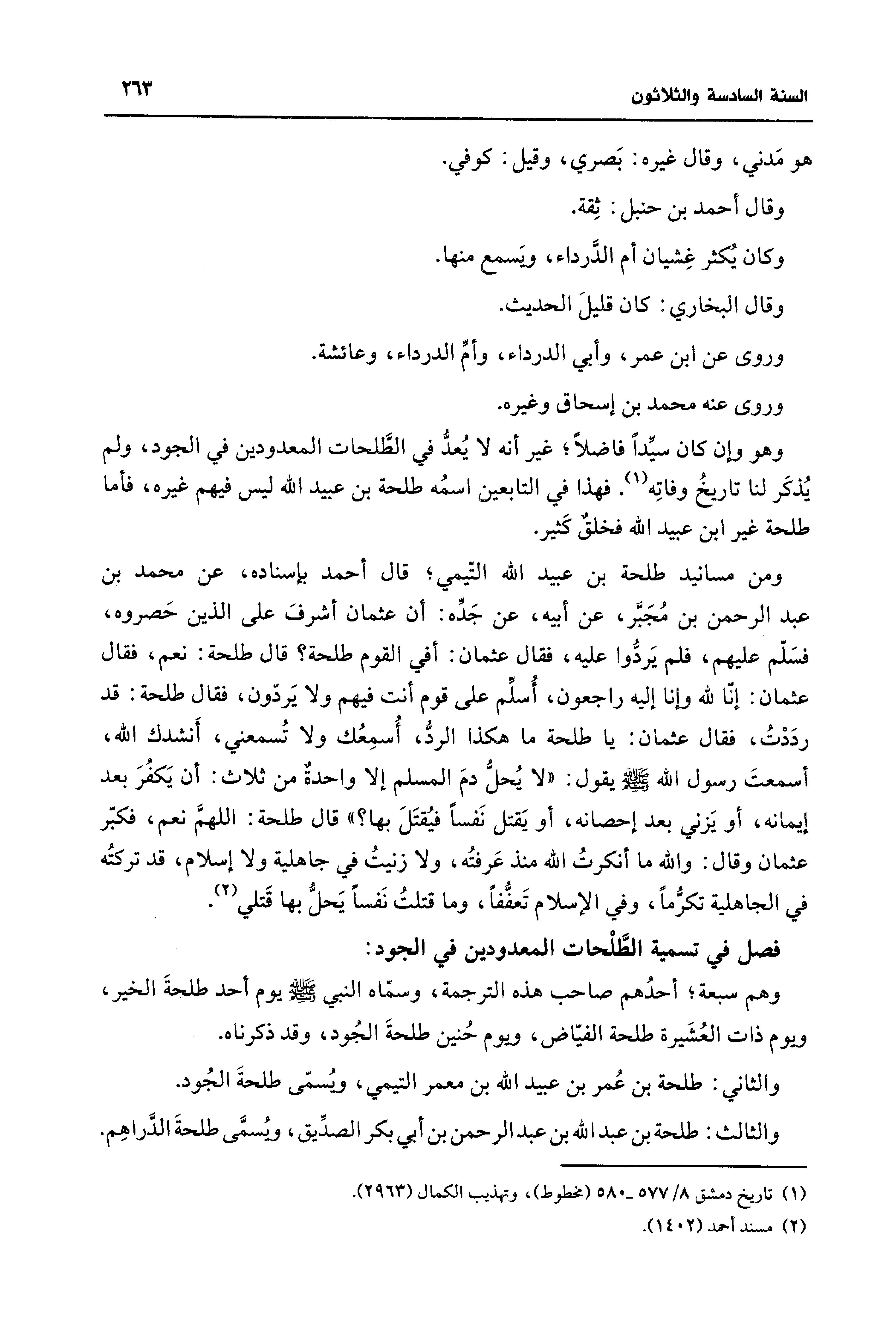 وهو وإن كان سيِّدًا فاضلًا؛ غير أنه لا يُعدُّ في الطَّلحات المعدودين في الجود، ولم يُذكَر لنا تاريخُ وفاتِه (¬1). فهذا في التابعين اسمُه طلحة بن عبيد الله ليس فيهم غيره، فأما طلحة غير ابن عبيد الله فخلقٌ كَثير.