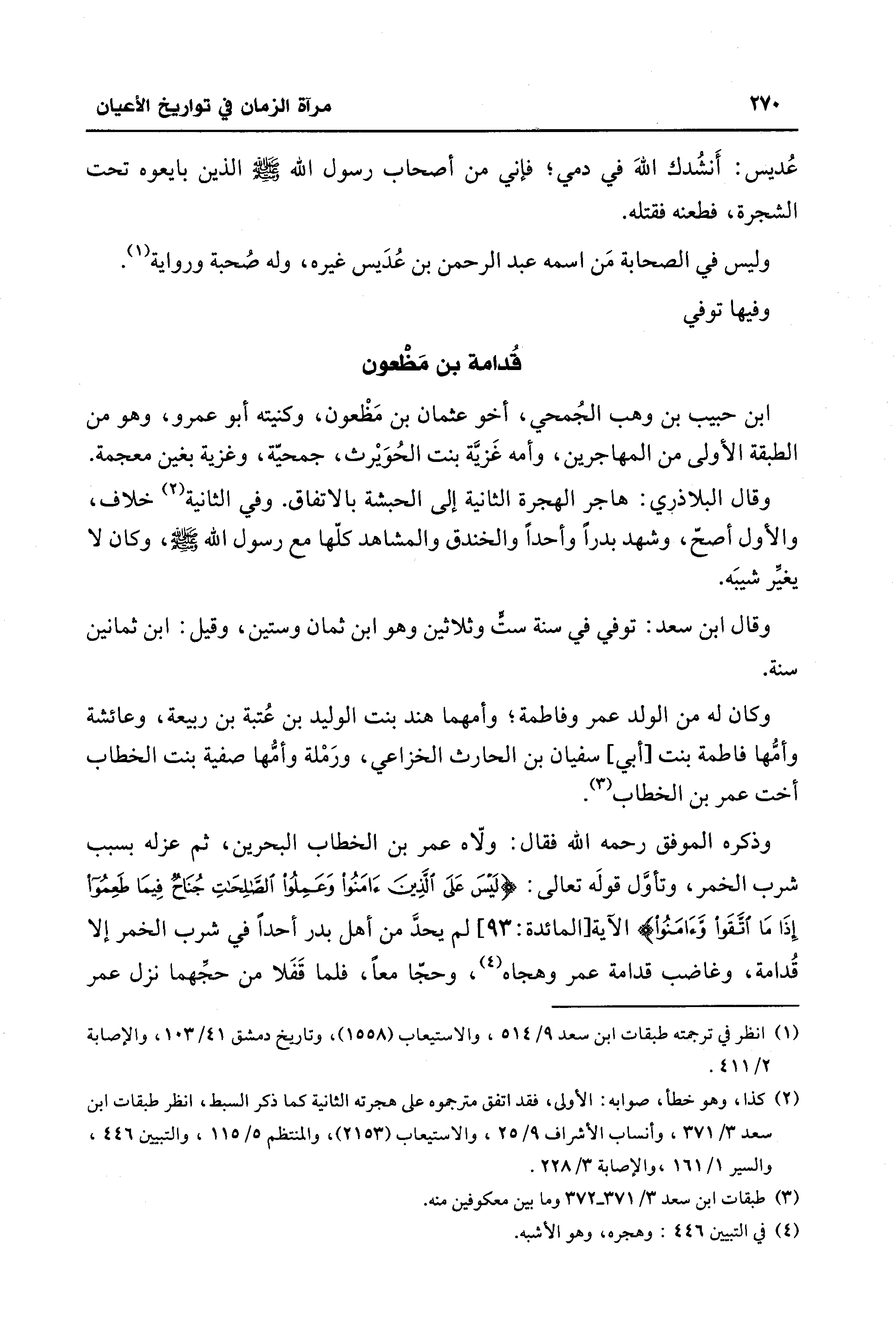 وذكره الموفق رحمه الله فقال: ولّاه عمر بن الخطاب البحرين، ثم عزله بسبب شرب الخمر، وتأوَّل قولَه تعالى: {لَيسَ عَلَى الَّذِينَ آمَنُوا وَعَمِلُوا الصَّالِحَاتِ جُنَاحٌ فِيمَا طَعِمُوا إِذَا مَا اتَّقَوْا وَآمَنُوا} [المائدة: 93]، لم يحدَّ من أهل بدر أحدًا في شرب الخمر إلا قُدامة، وغاضب قدامة عمر وهجاه (¬4)، وحجّا معًا، فلما قَفَلا من حجِّهما نزل عمر