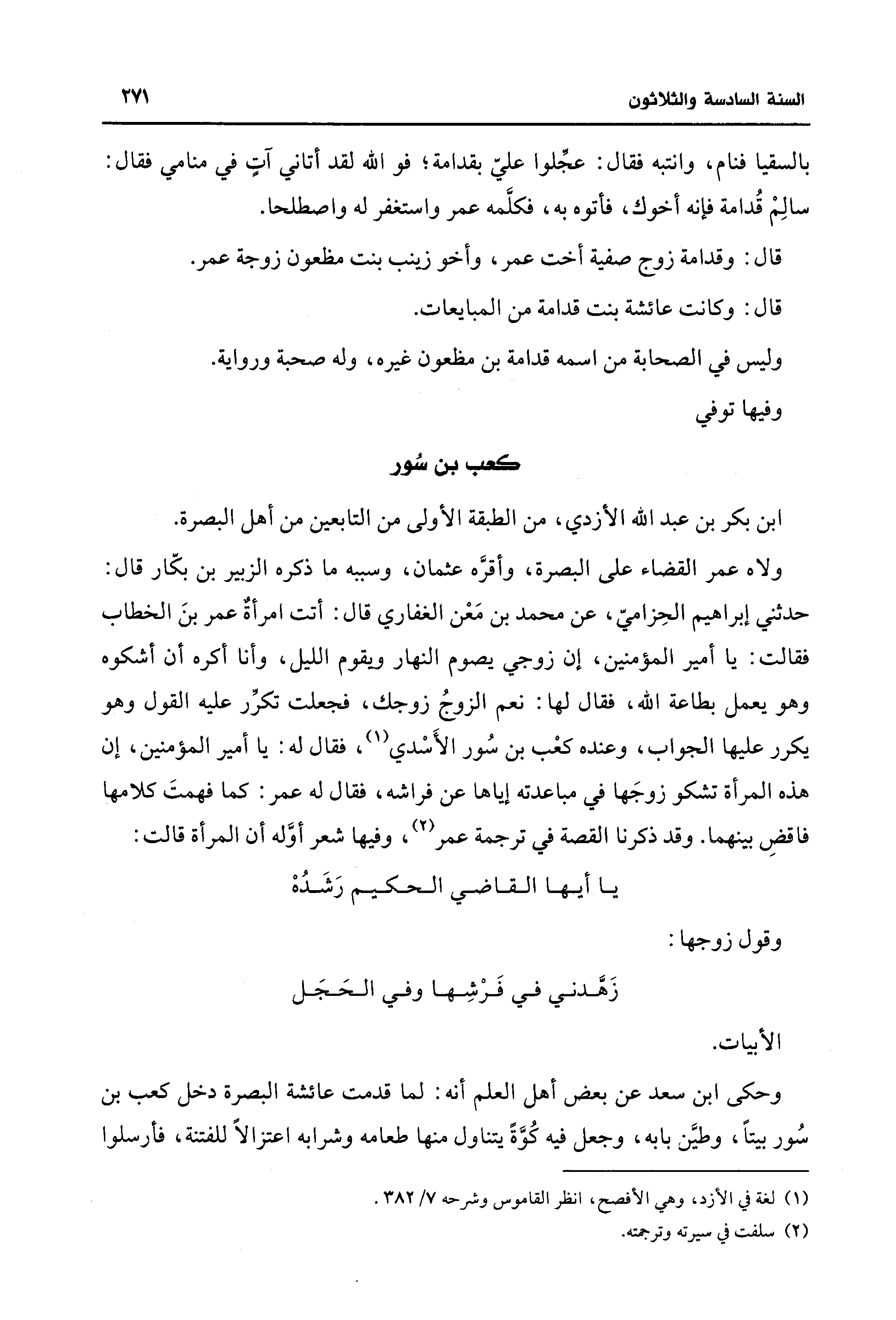 قال: وقدامة زوج صفية أخت عمر، وأخو زينب بنت مظعون زوجة عمر.