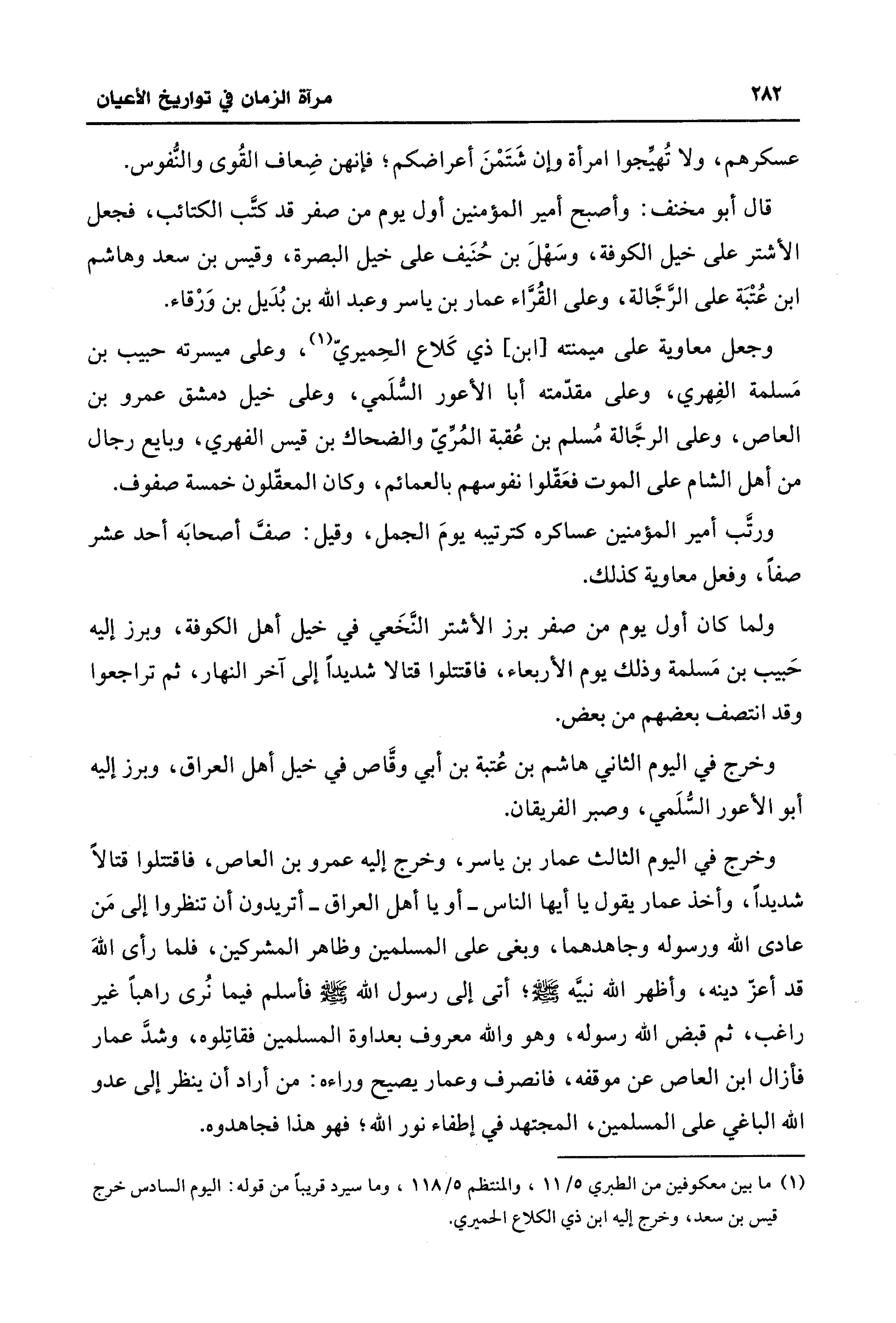 ورتَّب أمير المؤمنين عساكره كترتيبه يومَ الجمل، وقيل: صفَّ أصحابَه أحد عشر صفًّا، وفعل معاوية كذلك.