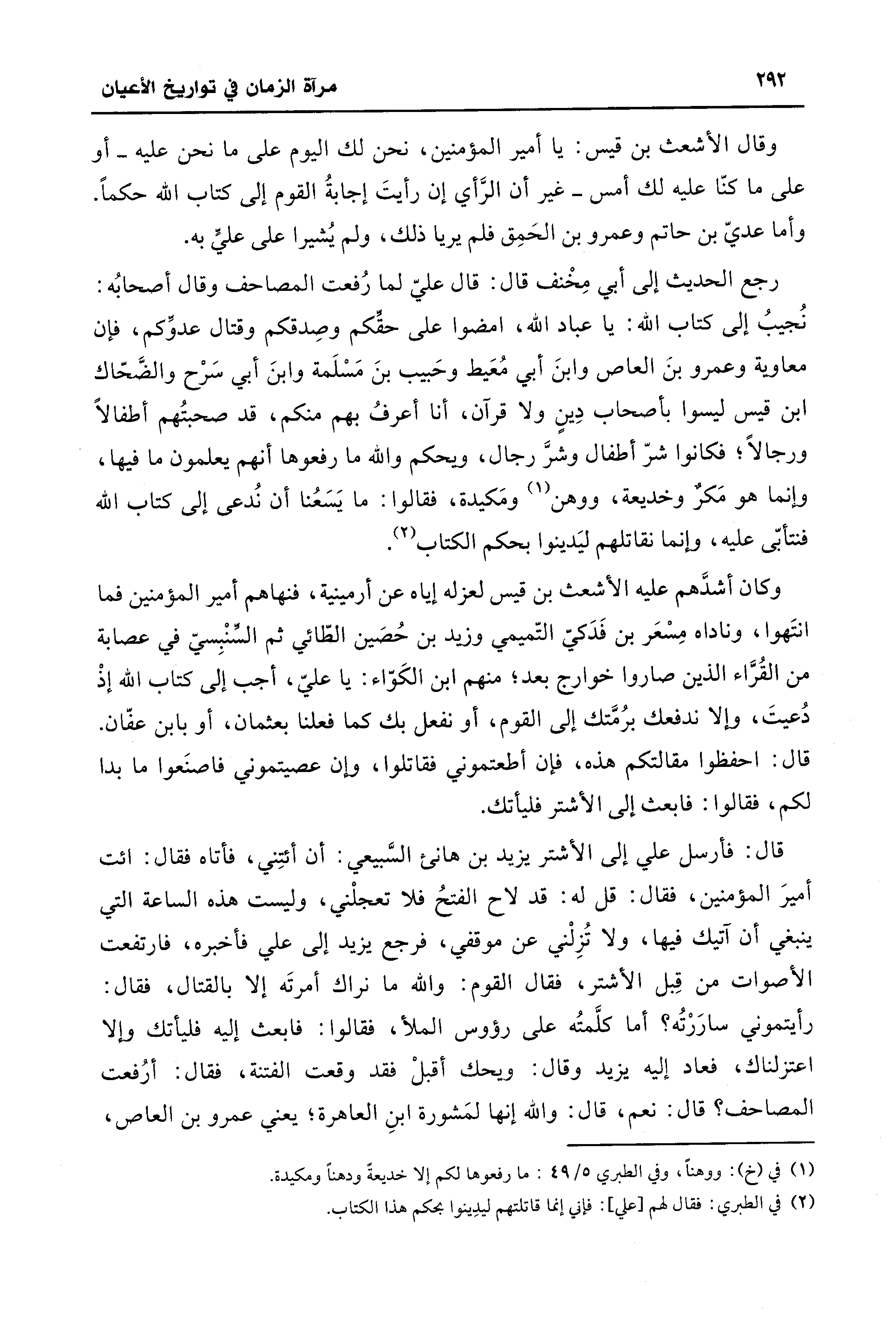 قال: فأرسل علي إلى الأشتر يزيد بن هانئ السَّبيعي: أن أئتِني، فأتاه فقال: ائت أميرَ المؤمنين، فقال: قل له: قد لاح الفتحُ فلا تعجلْني، وليست هذه الساعة التي ينبغي أن آتيك فيها، ولا تُزِلْني عن موقفي، فرجع يزيد إلى علي فأخبره، فارتفعت الأصوات من قِبل الأشتر، فقال القوم: والله ما نراك أمرتَه إلا بالقتال، فقال: رأيتموني سارَرْتُه؟ أما كلَّمتُه على رؤوس الملأ، فقالوا: فابعث إليه فليأتك وإلا اعتزلناك، فعاد إليه يزيد وقال: ويحك أقبلْ فقد وقدت الفتنة، فقال: أرُفعت المصاحف؟ قال: نعم، قال: والله إنها لمَشورة ابنِ العاهرة؛ يعني عمرو بن العاص،