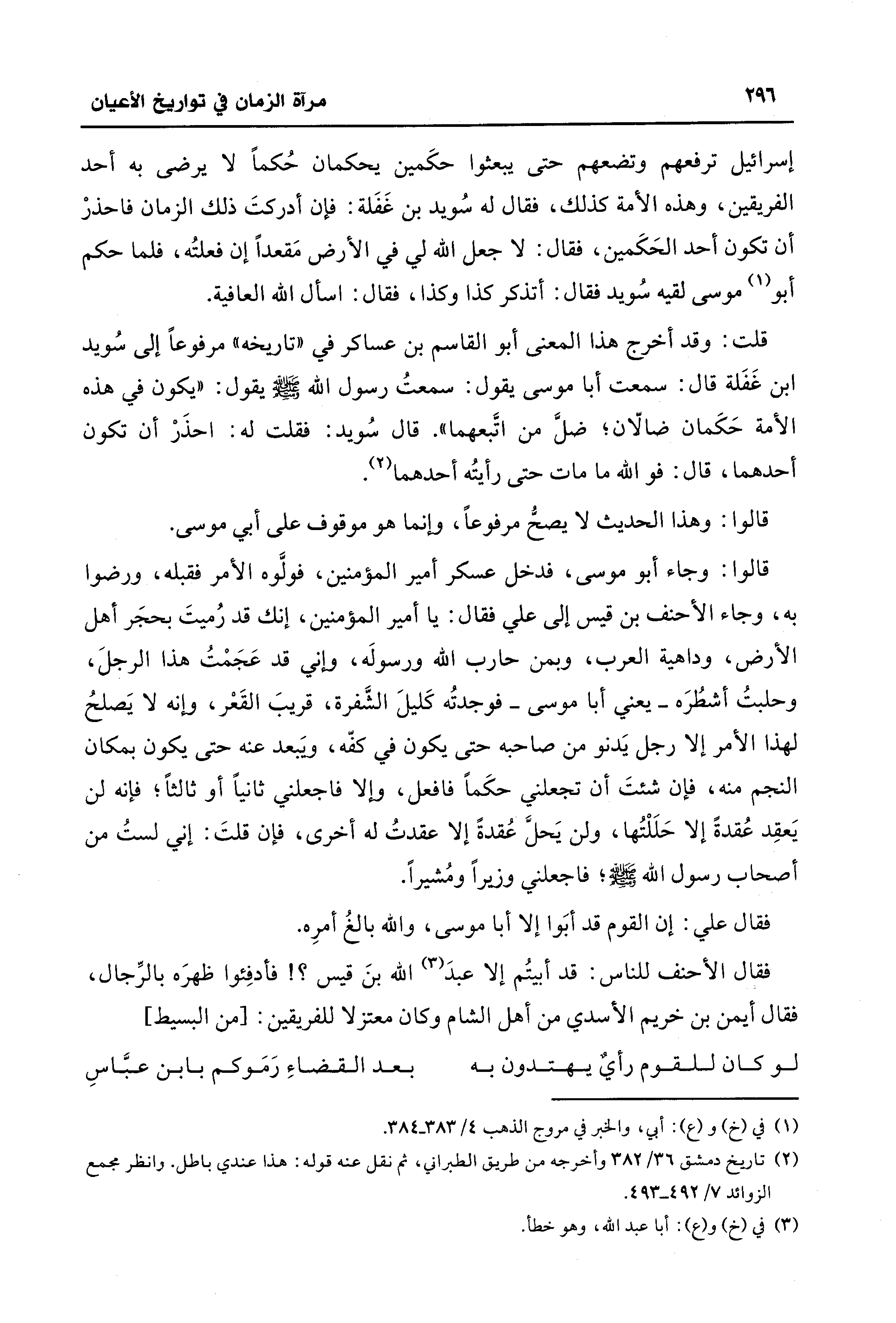 قلت: وقد أخرج هذا المعنى أبو القاسم بن عساكر في "تاريخه" مرفوعًا إلى سُويد بن غَفَلة قال: سمعت أبا موسى يقول: سمعتُ رسول الله - صلى الله عليه وسلم - يقول: "يكون في هذه الأمة حَكَمان ضالّان؛ ضل من اتَّبعهما". قال سُويد: فقلت له: احذَرْ أن تكون أحدهما، قال: فوالله ما مات حتَّى رأيتُه أحدهما (¬2).