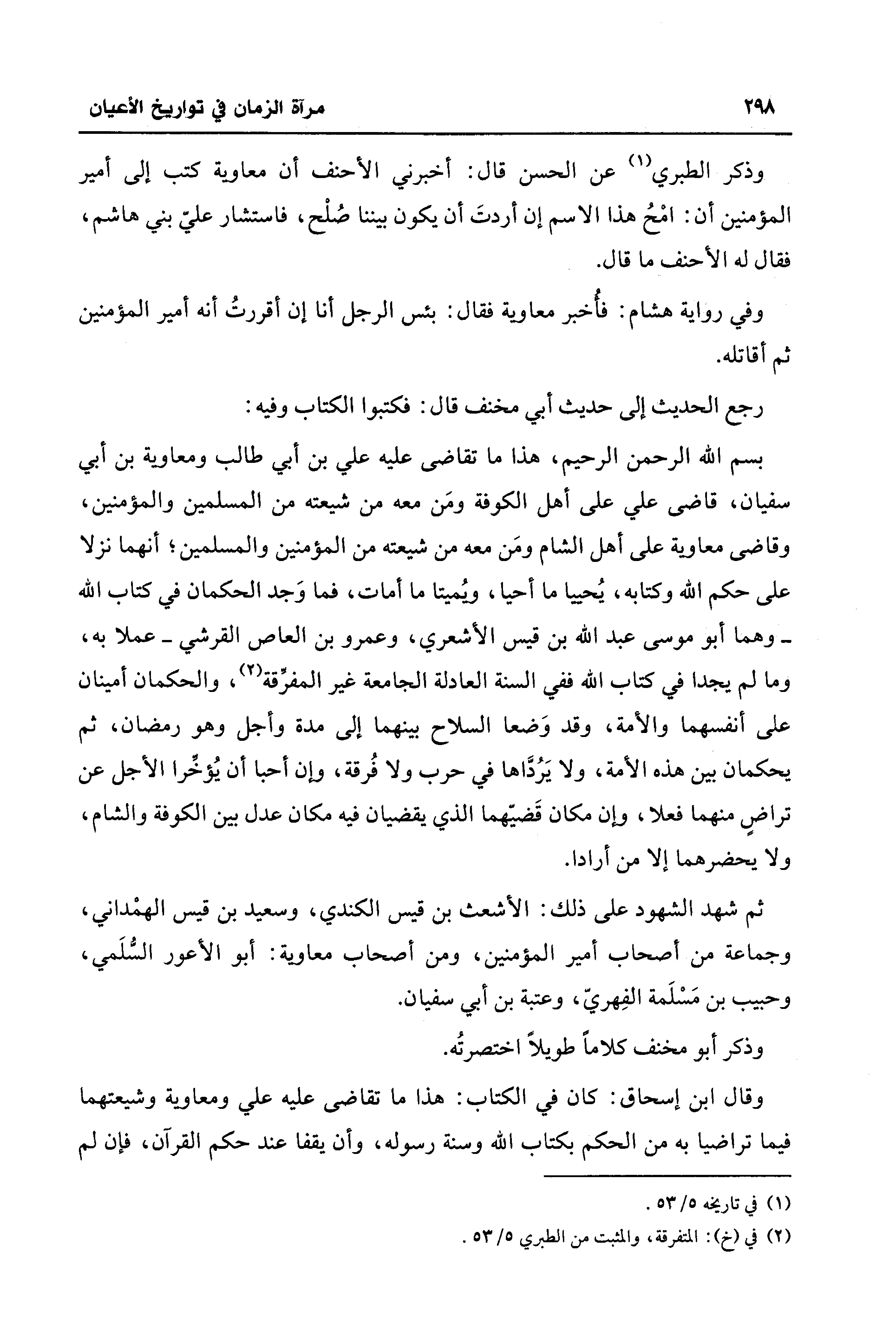 بِسْمِ اللَّهِ الرَّحْمَنِ الرَّحِيمِ، هذا ما تقاضى عليه علي بن أبي طالب ومعاوية بن أبي سفيان، قاضى علي على أهل الكوفة ومَن معه من شيعته من المسلمين والمؤمنين، وقاضى معاوية على أهل الشام ومَن معه من شيعته من المؤمنين والمسلمين؛ أنهما نزلا على حكم الله وكتابه، يُحييا ما أحيا، ويُميتا ما أمات، فما وَجد الحكمان في كتاب الله -وهما أبو موسى عبد الله بن قيس الأشعري، وعمرو بن العاص القرشي- عملا به، وما لم يجدا في كتاب الله ففي السنة العادلة الجامعة غير المفرِّقة (¬2)، والحكمان أمينان على أنفسهما والأمة، وقد وَضعا السلاح بينهما إلى مدة وأجل وهو رمضان، ثم يحكمان بين هذه الأمة، ولا يَرُدَّاها في حرب ولا فُرقة، وإن أحبا أن يُؤخِّرا الأجل عن تراضٍ منهما فعلا، وإن مكان قَضيّهما الَّذي يقضيان فيه مكان عدل بين الكوفة والشام، ولا يحضرهما إلا من أرادا.