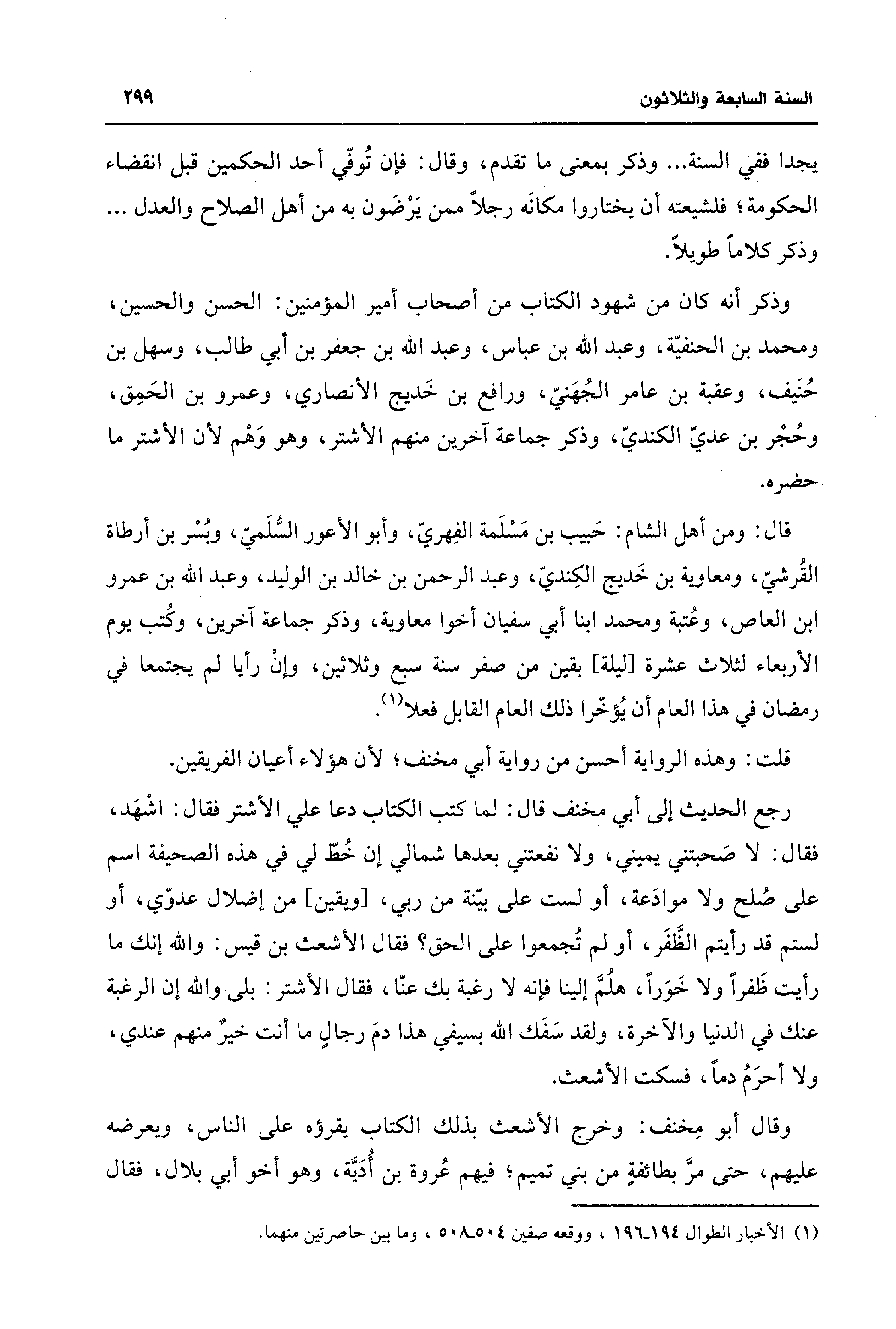 رجع الحديث إلى أبي مخنف قال: لما كتب الكتاب دعا علي الأشتر فقال: اشْهَد، فقال: لا صَحبتني يميني، ولا نفعتني بعدها شمالي إن خُطّ لي في هذه الصحيفة اسم على صُلح ولا موادَعة، أو لست على بيّنة من ربي، [ويقين] من إضلال عدوّي، أو لستم قد رأيتم الظَّفَر، أو لم تُجمعوا على الحق؟ فقال الأشعث بن قيس: والله إنك ما رأيت ظَفرًا ولا خَوَرًا، هلُمَّ إلينا فإنه لا رغبة بك عنّا، فقال الأشتر: بلى والله إن الرغبة عنك في الدنيا والآخرة، ولقد سَفَك الله بسيفي هذا دمَ رجالٍ ما أنت خير منهم عندي، ولا أحرَمُ دمًا، فسكت الأشعث.