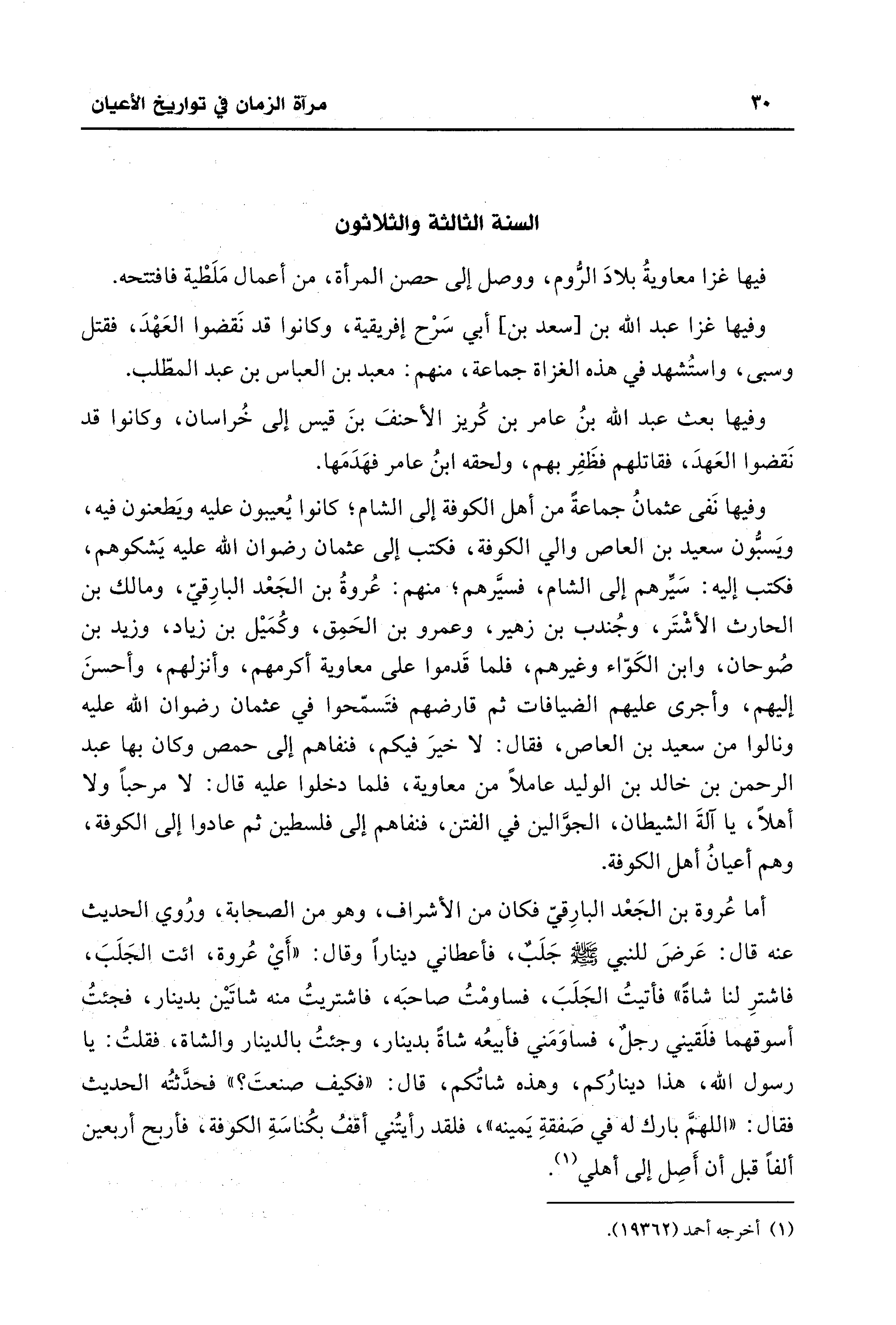 وفيها نَفى عثمانُ جماعةً من أهل الكوفة إلى الشام؛ كانوا يُعيبون عليه ويَطعنون فيه، وَيسبُّون سعيد بن العاص والي الكوفة، فكتب إلى عثمان رضوان الله عليه يَشكوهم، فكتب إليه: سَيِّرهم إلى الشام، فسيَّرهم؛ منهم: عُروةُ بن الجَعْد البارِقيّ، ومالك بن الحارث الأشْتَر، وجُندب بن زهير، وعمرو بن الحَمِق، وكُمَيل بن زياد، يزيد بن صُوحان، وابن الكَوّاء وغيرهم، فلما قَدموا على معاوية أكرمهم، وأنزلهم، وأحسنَ إليهم، وأجرى عليهم الضيافات ثم قارضهم فتَسمّحوا في عثمان رضوان الله عليه ونالوا من سعيد بن العاص، فقال: لا خيرَ فيكم، فنفاهم إلى حمص وكان بها عبد الرحمن بن خالد بن الوليد عاملًا من معاوية، فلما دخلوا عليه قال: لا مرحبًا ولا أهلًا، يا آلةَ الشَّيطان، الجوَّالين في الفتن، فنفاهم إلى فلسطين ثم عادوا إلى الكوفة، وهم أعيانُ أهل الكوفة.