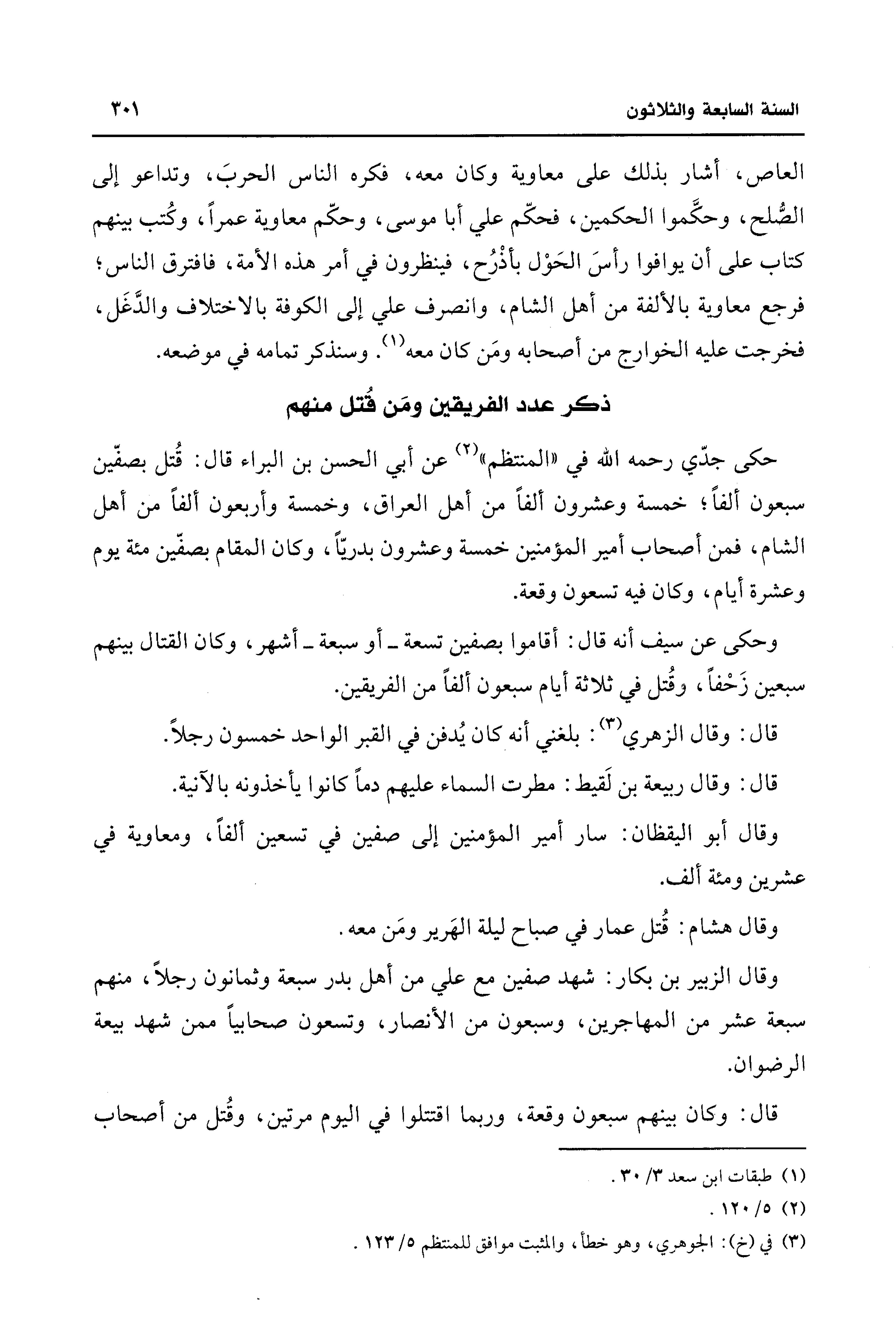 وحكى عن سيف أنَّه قال: أقاموا بصفين تسعة -أو سبعة- أشهر، وكان القتال بينهم سبعين زَحْفًا، وقُتل في ثلاثة أيام سبعون ألفًا من الفريقين.