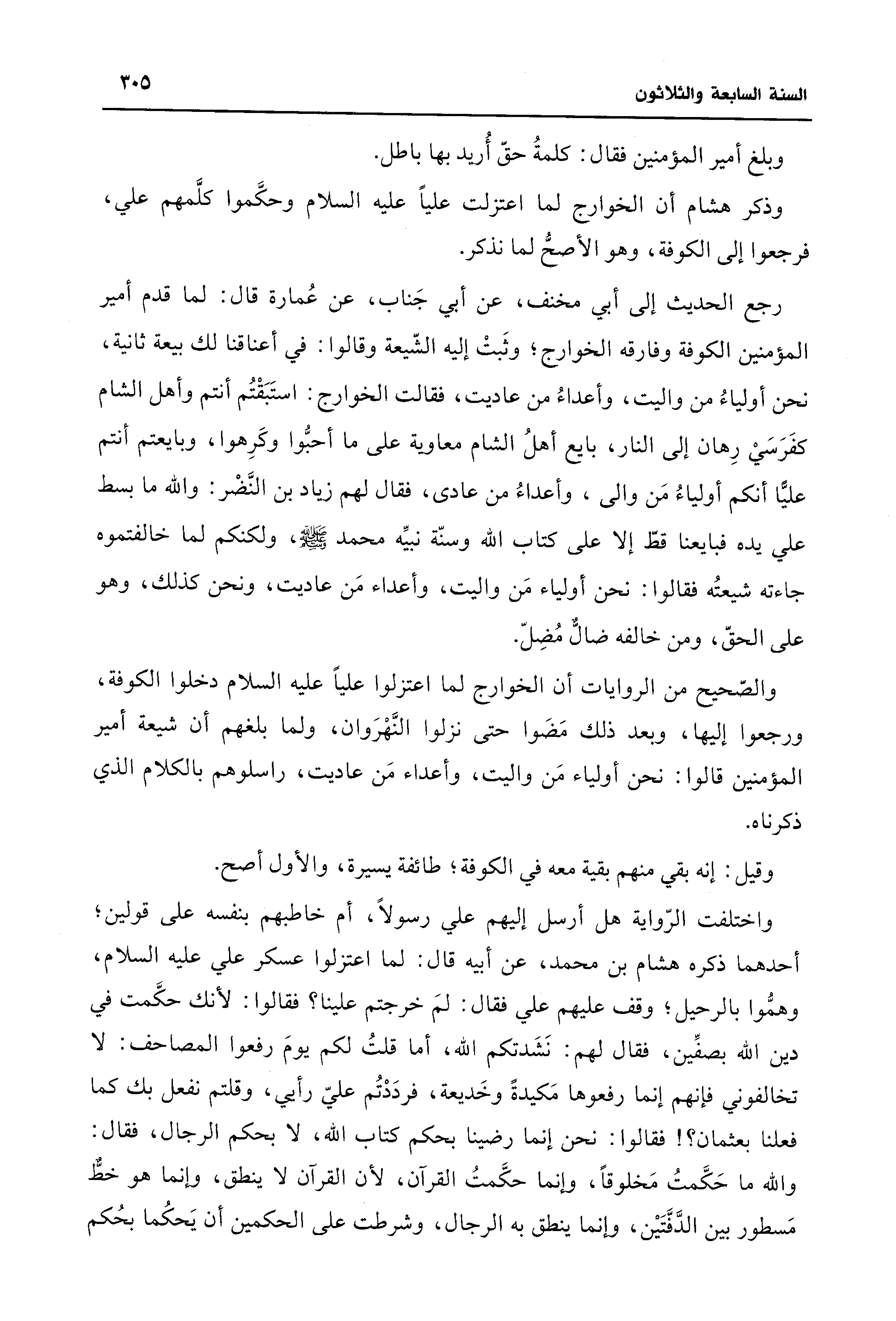 رجع الحديث إلى أبي مخنف، عن أبي جَناب، عن عُمارة قال: لما قدم أمير المؤمنين الكوفة وفارقه الخوارج؛ وثَبتْ إليه الشّيعة وقالوا: في أعناقنا لك بيعة ثانية، نحن أولياءُ من واليت، وأعداءُ من عاديت، فقالت الخوارج: استَبَقْتُم أنتم وأهل الشام كفَرَسَيْ رِهان إلى النار، بايع أهلُ الشام معاوية على ما أحبُّوا وكَرِهوا، وبايعتم أنتم عليًّا أنكم أولياءُ مَن والى، وأعداءُ من عادى، فقال لهم زياد بن النَّضْر: والله ما بسط علي يده فبايعنا قطّ إلا على كتاب الله وسنّة نبيِّه محمد - صلى الله عليه وسلم -، ولكنكم لما خالفتموه جاءته شيعتُه فقالوا: نحن أولياء مَن واليت، وأعداء مَن عاديت، ونحن كذلك، وهو على الحقّ، ومن خالفه ضالٌّ مُضِلّ.