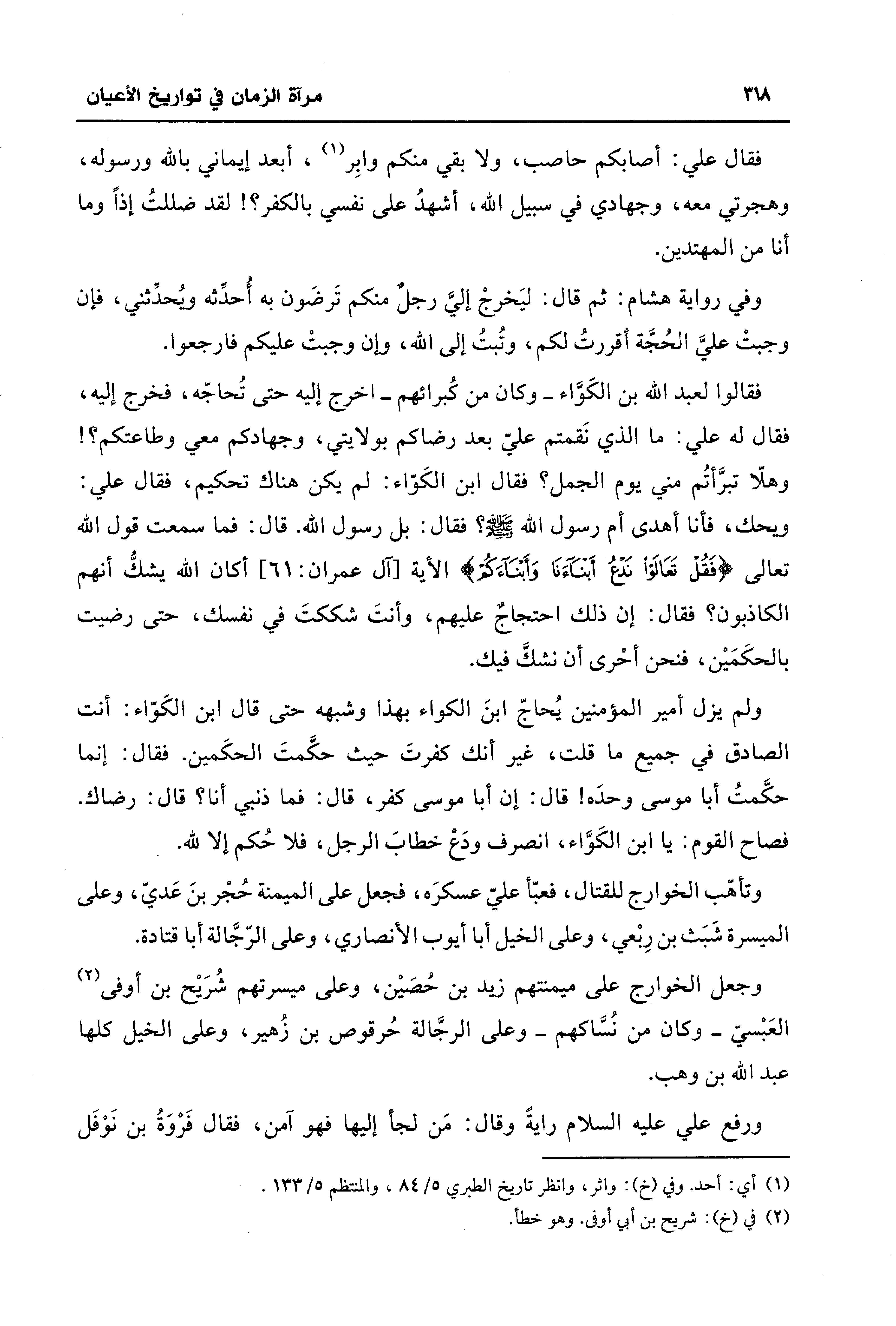 ولم يزل أمير المؤمنين يُحاجّ ابنَ الكواء بهذا وشبهه حتَّى قال ابن الكَوّاء: أنت الصادق في جميع ما قلت، غير أنك كفرتَ حيث حكَّمتَ الحكَمين. فقال: إنما حكَّمتُ أبا موسى وحدَه! قال: إن أبا موسى كفر، قال: فما ذنبي أنا؟ قال: رضاك. فصاح القوم: يا ابن الكَوَّاء، انصرف ودَعْ خطابَ الرجل، فلا حُكم إلا لله.