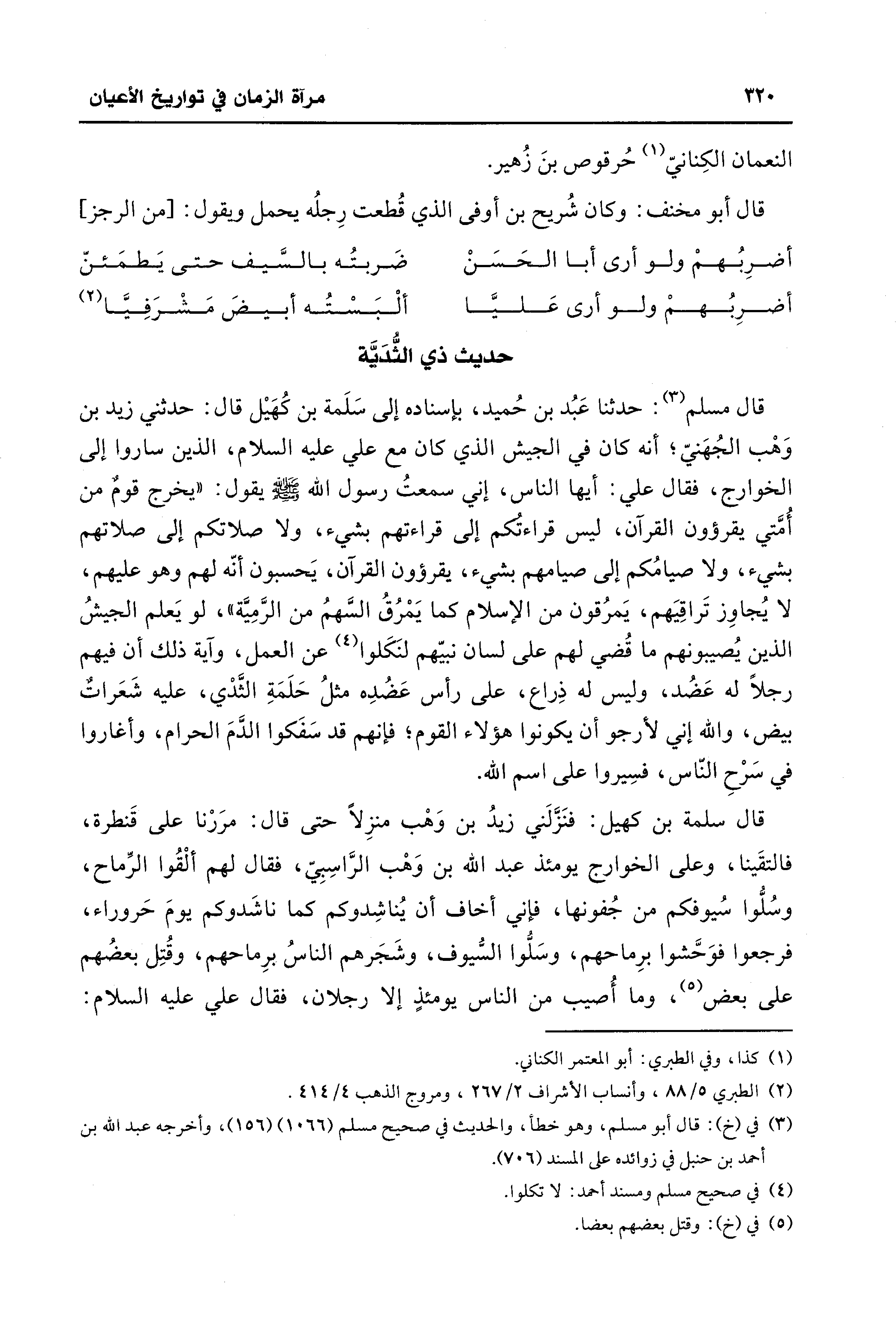 قال مسلم (¬3): حدثنا عَبُد بن حُميد، بإسناده إلى سَلَمة بن كُهَيل قال: حدثني زيد بن وَهْب الجُهَنيّ؛ أنَّه كان في الجيش الَّذي كان مع علي - عليه السلام -، الذين ساروا إلى الخوارج، فقال علي: أيها الناس، إني سمعتُ رسول الله - صلى الله عليه وسلم - يقول: "يخرج قومٌ من أُمَّتي يقرؤون القرآن، ليس قراءتكم إلى قراءتهم بشيء، ولا صلاتكم إلى صلاتهم بشيء، ولا صيامُكم إلى صيامهم بشيء، يقرؤون القرآن، يَحسبون أنّه لهم وهو عليهم، لا يُجاوز تَراقِيَهم، يَمرُقون من الإسلام كما يَمْرُقُ السَّهمُ من الرَّمِيَّة"، لو يَعلم الجيشُ الذين يُصيبونهم ما قُضي لهم على لسان نبيّهم لنَكَلوا (¬4) عن العمل، وآية ذلك أن فيهم رجلًا له عَضُد، وليس له ذِراع، على رأس عَضُدِه مثلُ حَلَمَةِ الثَّدْي، عليه شَعَراتٌ بيض، والله إني لأرجو أن يكونوا هؤلاء القوم؛ فإنهم قد سَفَكوا الدَّمَ الحرام، وأغاروا في سَرْحِ النّاس، فسِيروا على اسم الله.