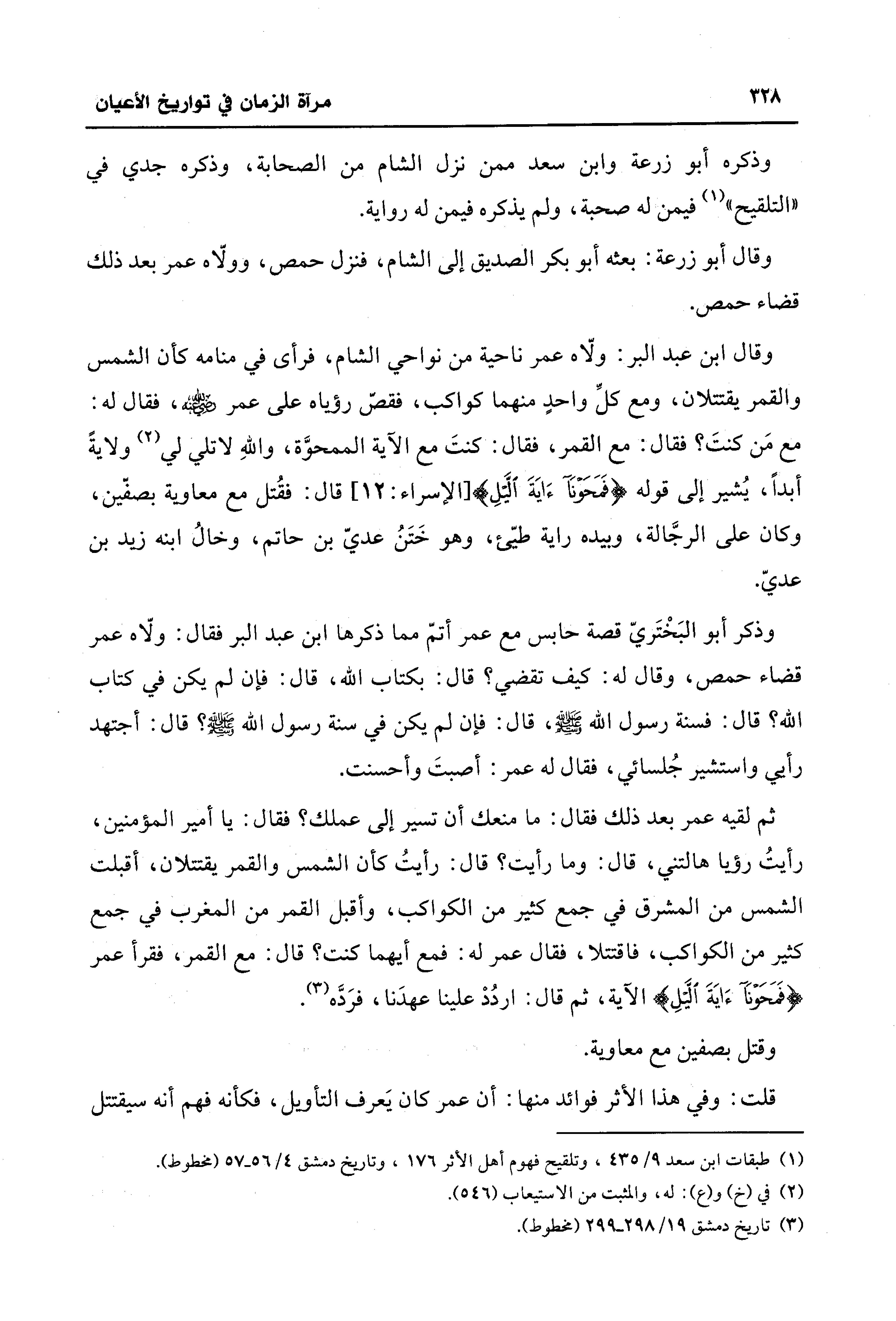 ثم لقيه عمر بعد ذلك فقال: ما منعك أن تسير إلى عملك؟ فقال: يا أمير المؤمنين، رأيتُ رؤيا هالتني، قال: وما رأيت؟ قال: رأيتُ كأن الشمس والقمر يقتتلان، أقبلت الشمس من المشرق في جمع كثير من الكواكب، وأقبل القمر من المغرب في جمع كثير من الكواكب، فاقتتلا، فقال عمر له: فمع أيهما كنت؟ قال: مع القمر، فقرأ عمر {فَمَحَوْنَا آيَةَ الَّلْيلِ} الآية، ثم قال: اردُدْ علينا عهدَنا، فرَدَّه (¬3).