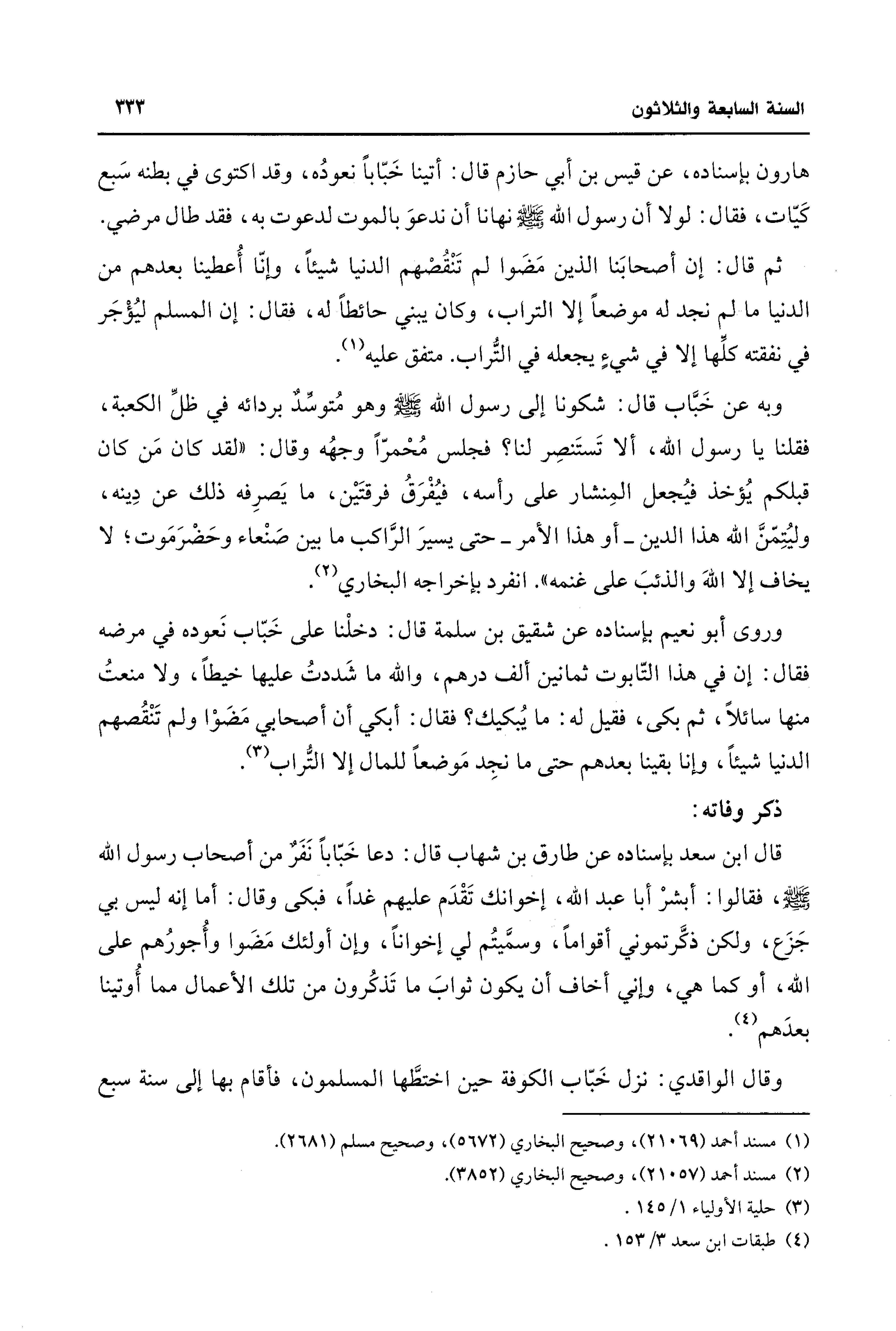 وروى أبو نعيم بإسناده عن شقيق بن سلمة قال: دخلْنا على خَبّاب نَعوده في مرضه فقال: إن في هذا التّابوت ثمانين ألف درهم، والله ما شَددتُ عليها خيطًا، ولا منعتُ منها سائلًا، ثم بكى، فقيل له: ما يُبكيك؛ فقال: أبكي أن أصحابي مَضَوْا ولم تَنْقُصهم الدنيا شيئًا، وإنا بقينا بعدهم حتَّى ما نجِد مَوضعًا للمال إلا التُّراب (¬3).
