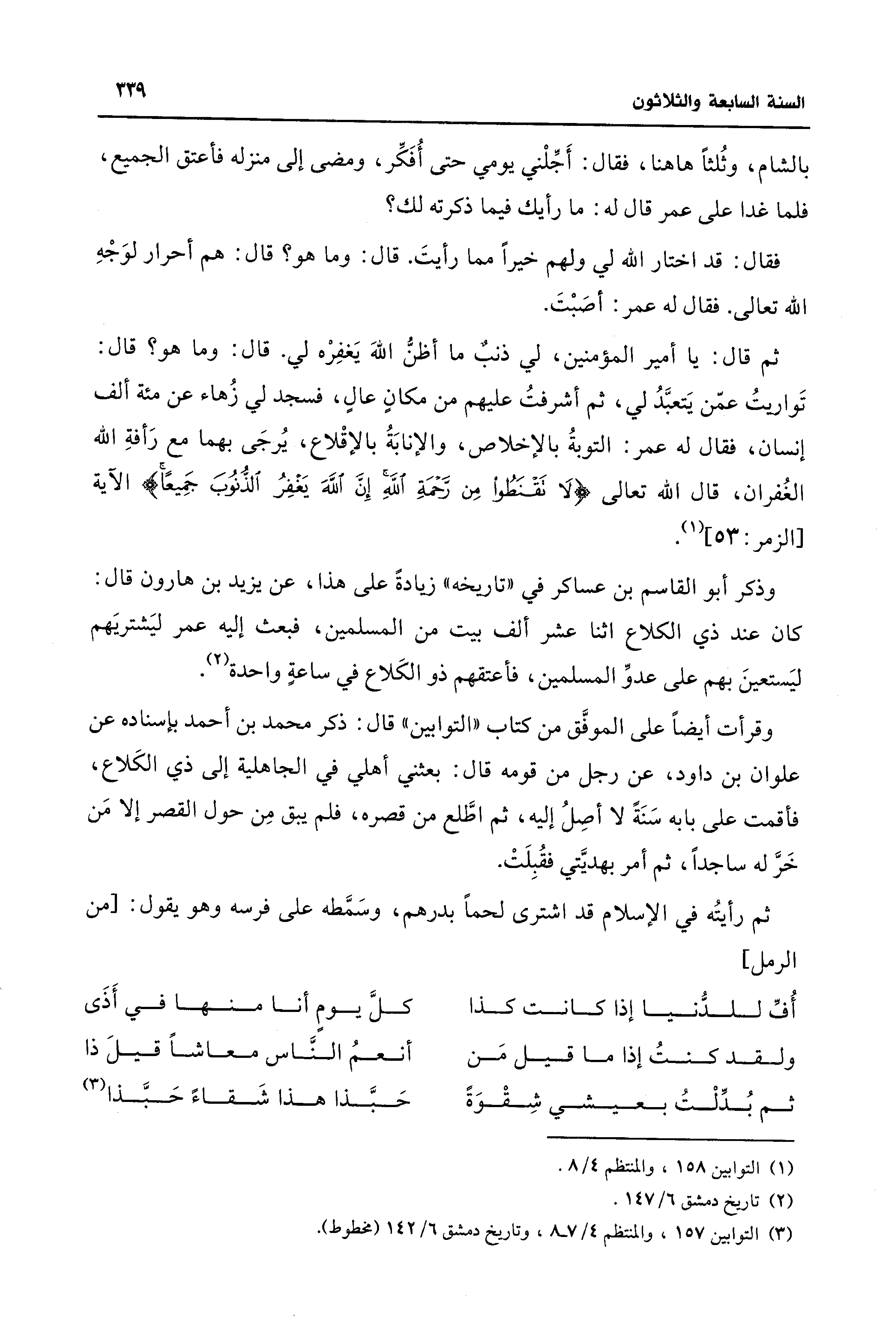 ثم قال: يا أمير المؤمنين، لي ذنبٌ ما أظنّ اللهَ يَغفِرْه لي. قال: وما هو؟ قال تَواريتُ عمّن يَتعبَّدُ لي، ثم أشرفتُ عليهم من مكانٍ عالي، فسجد لي زُهاء عن مئة ألف إنسان، فقال له عمر: التوبةُ بالإخلاص، والإنابَةُ بالإقْلاع، يُرجَى بهما مع رَأفةِ الله الغُفران، قال الله تعالى {لَا تَقْنَطُوا مِن رَحْمَةِ اللَّهِ إِنَّ اللَّهَ يَغْفِرُ الْذُّنُوبَ جَمِيعًا} الآية [الزمر: 53] (¬1).