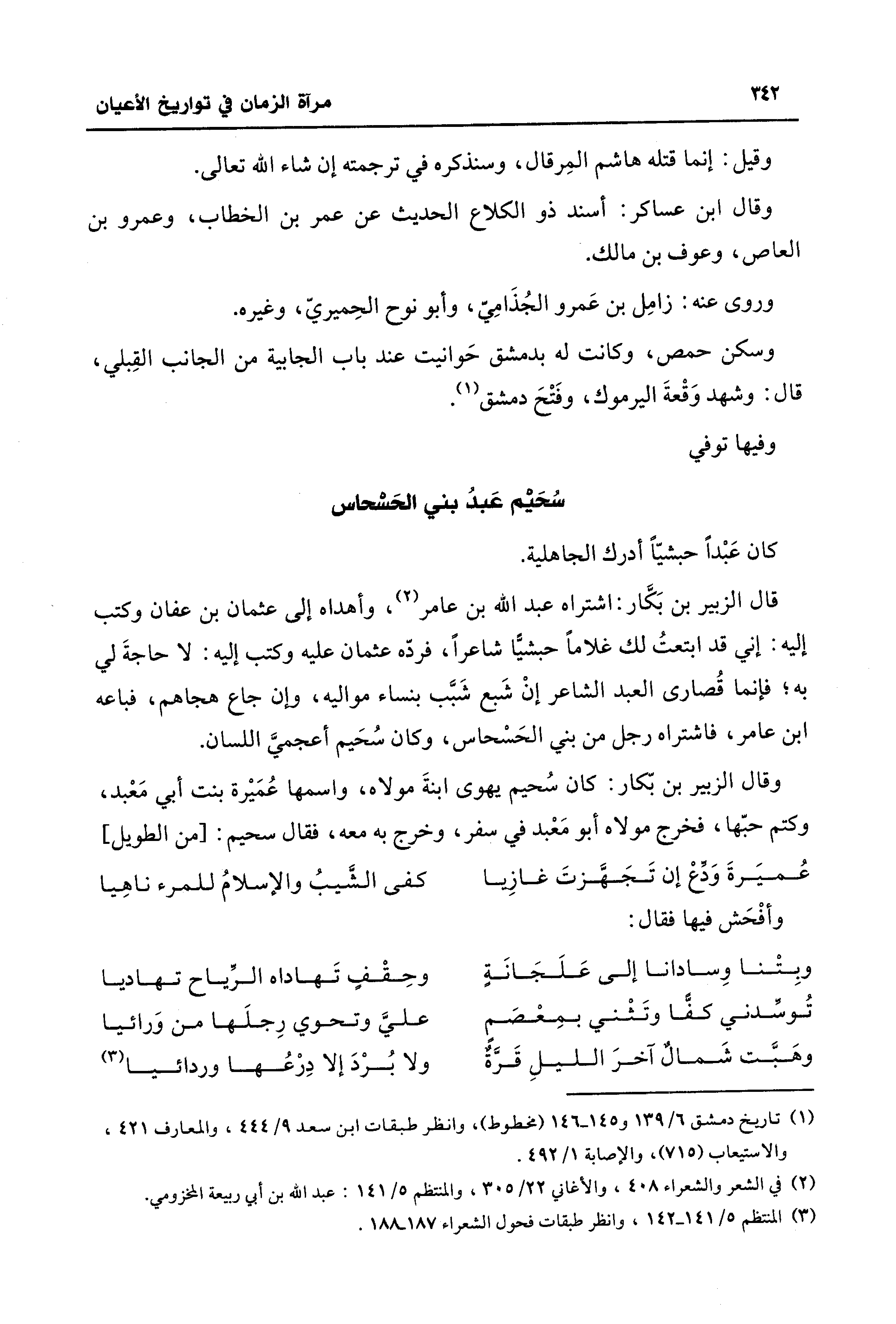 قال الزبير بن بَكَّار: اشتراه عبد الله بن عامر (¬2)، وأهداه إلى عثمان بن عفان وكتب إليه: إني قد ابتعتُ لك غلامًا حبشيًّا شاعرًا، فردّه عثمان عليه وكتب إليه: لا حاجةَ لي به؛ فإنما قُصارى العبد الشاعر إنْ شَبع شَبَّب بنساء مواليه، وإن جاع هجاهم، فباعه ابن عامر، فاشتراه رجل من بني الحَسْحاس، وكان سُحَيم أعجميَّ اللسان.