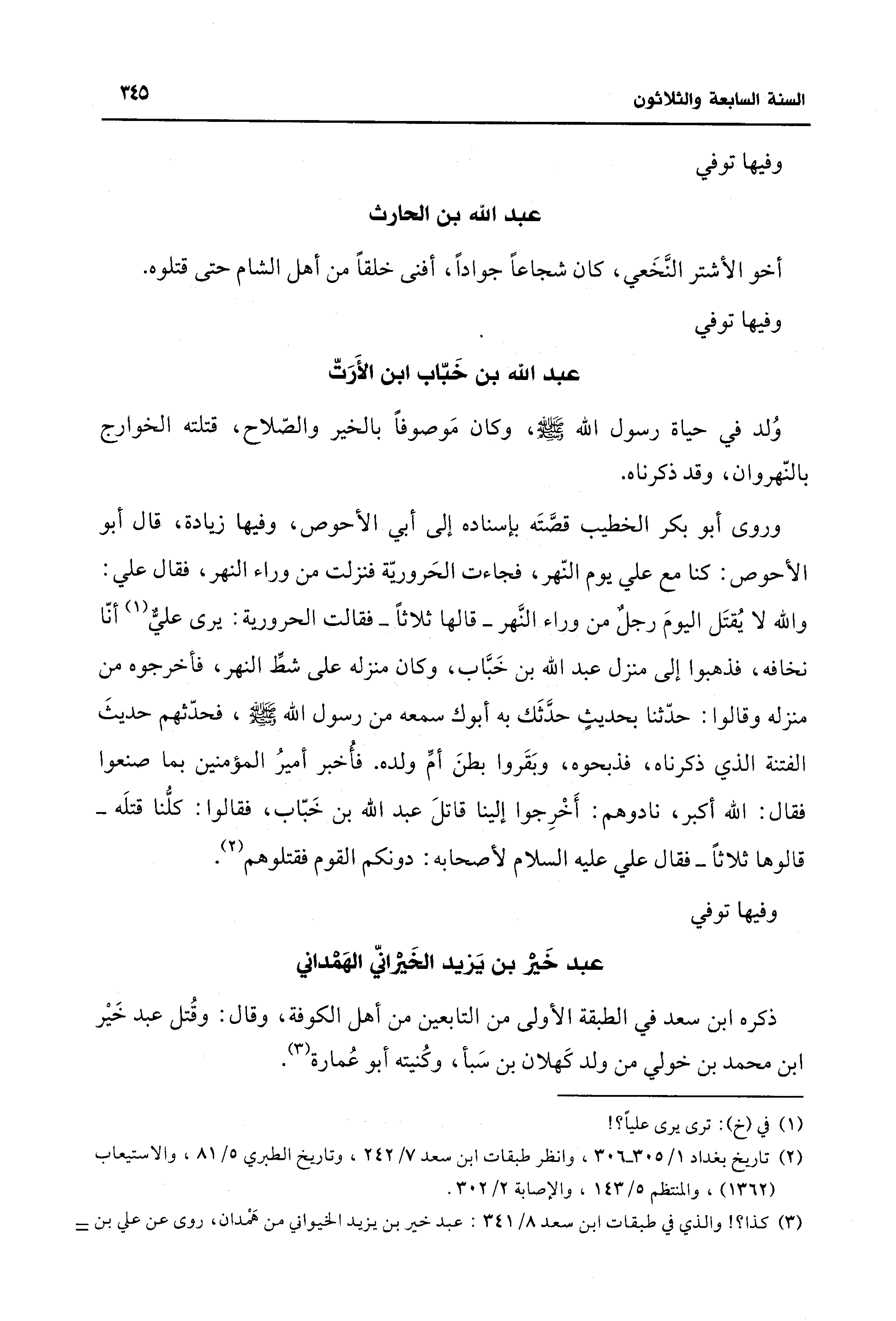 (¬2) تاريخ بغداد 1/ 305 - 306، وانظر طبقات ابن سعد 7/ 242، وتاريخ الطبري 5/ 81، والاستيعاب (1362)، والمنتظم 5/ 143، والإصابة 2/ 302.