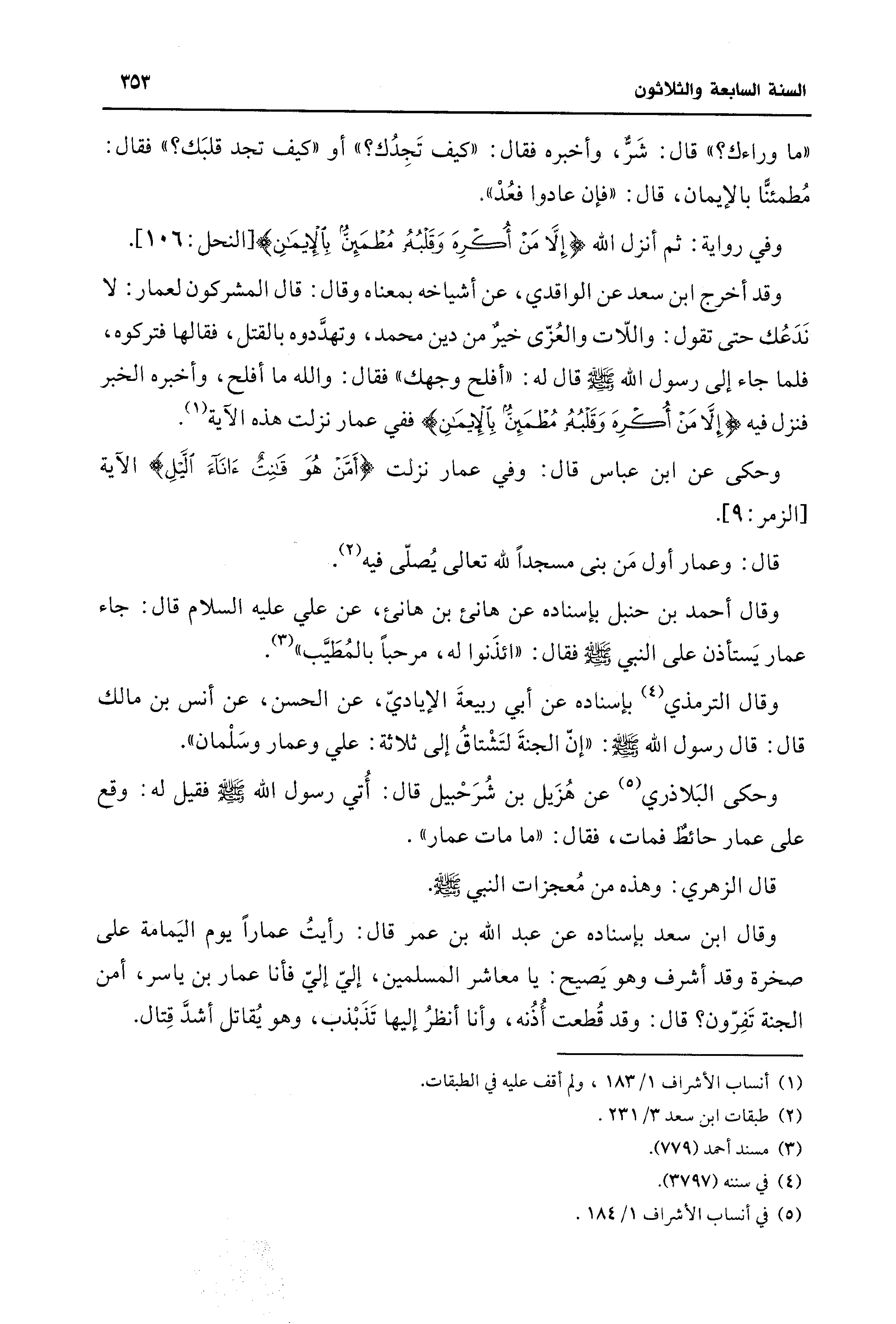 وقد أخرج ابن سعد عن الواقدي، عن أشياخه بمعناه وقال: قال المشركون لعمار: لا نَدَعُك حتَّى تقول: واللّات والعُزّى خيرٌ من دين محمد، وتهدَّدوه بالقتل، فقالها فتركوه، فلما جاء إلى رسول الله - صلى الله عليه وسلم - قال له: "أفلح وجهك" فقال والله ما أفلح، وأخبره الخبر فنزل فيه {إلا مَنْ أُكْرِهَ وَقَلْبُهُ مُطمَئِنٌّ بِالإِيِمَانِ} ففي عمار نزلت هذه الآية (¬1).