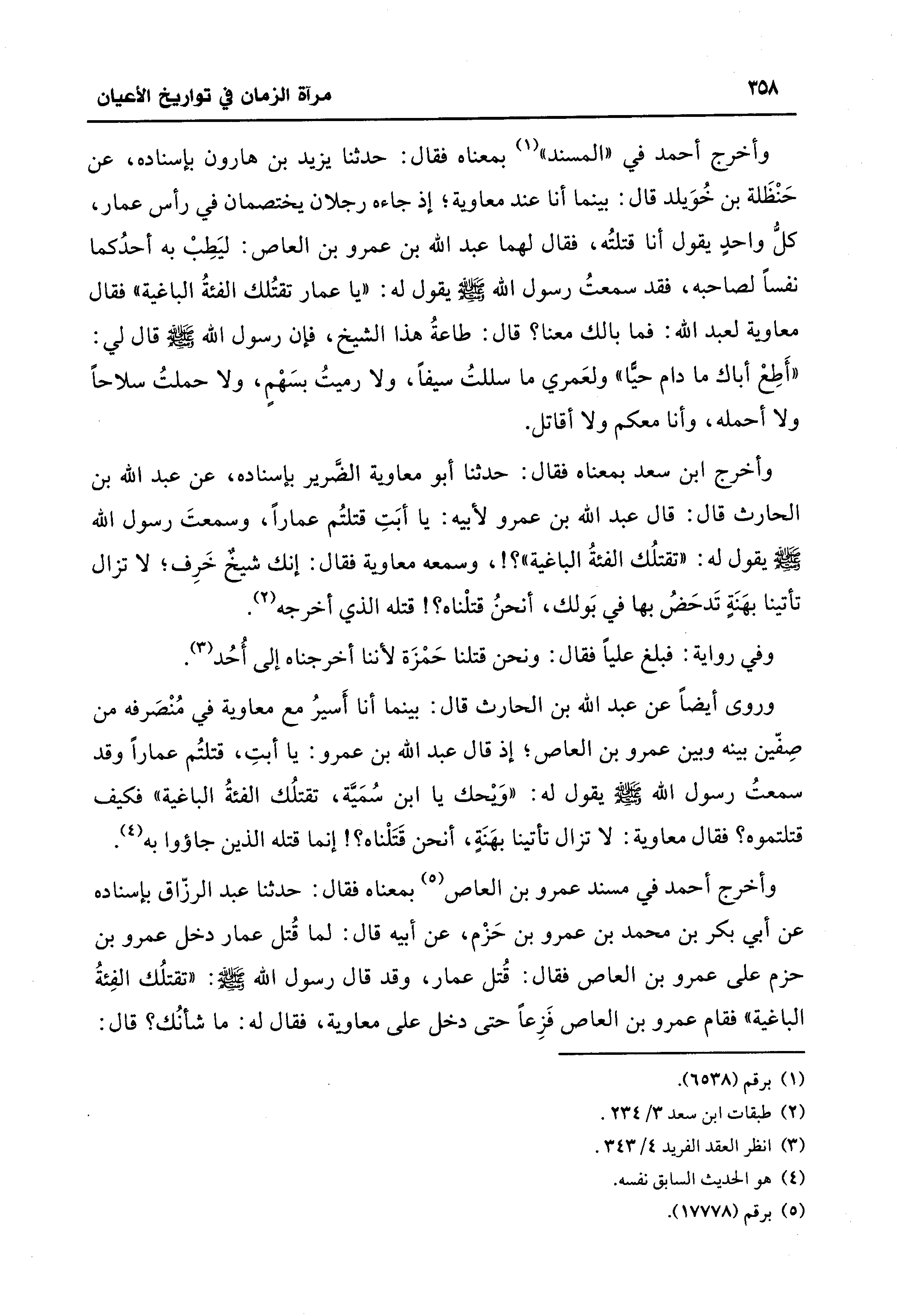 وروى أيضًا عن عبد الله بن الحارث قال: بينما أنا أَسيرُ مع معاوية في مُنْصَرفه من صِفِّين بينه وبين عمرو بن العاص؛ إذ قال عبد الله بن عمرو: يا أبتِ، قتلتُم عمارًا وقد سمعتُ رسول الله - صلى الله عليه وسلم - يقول له: "ويحك يا ابن سُمَيَّة، تقتلُك الفئةُ الباغية" فكيف قتلتموه؟ فقال معاوية: لا تزال تأتينا بهَنَةٍ، أنحن قَتَلْناه؟ ! إنما قتله الذين جاؤوا به (¬4).
