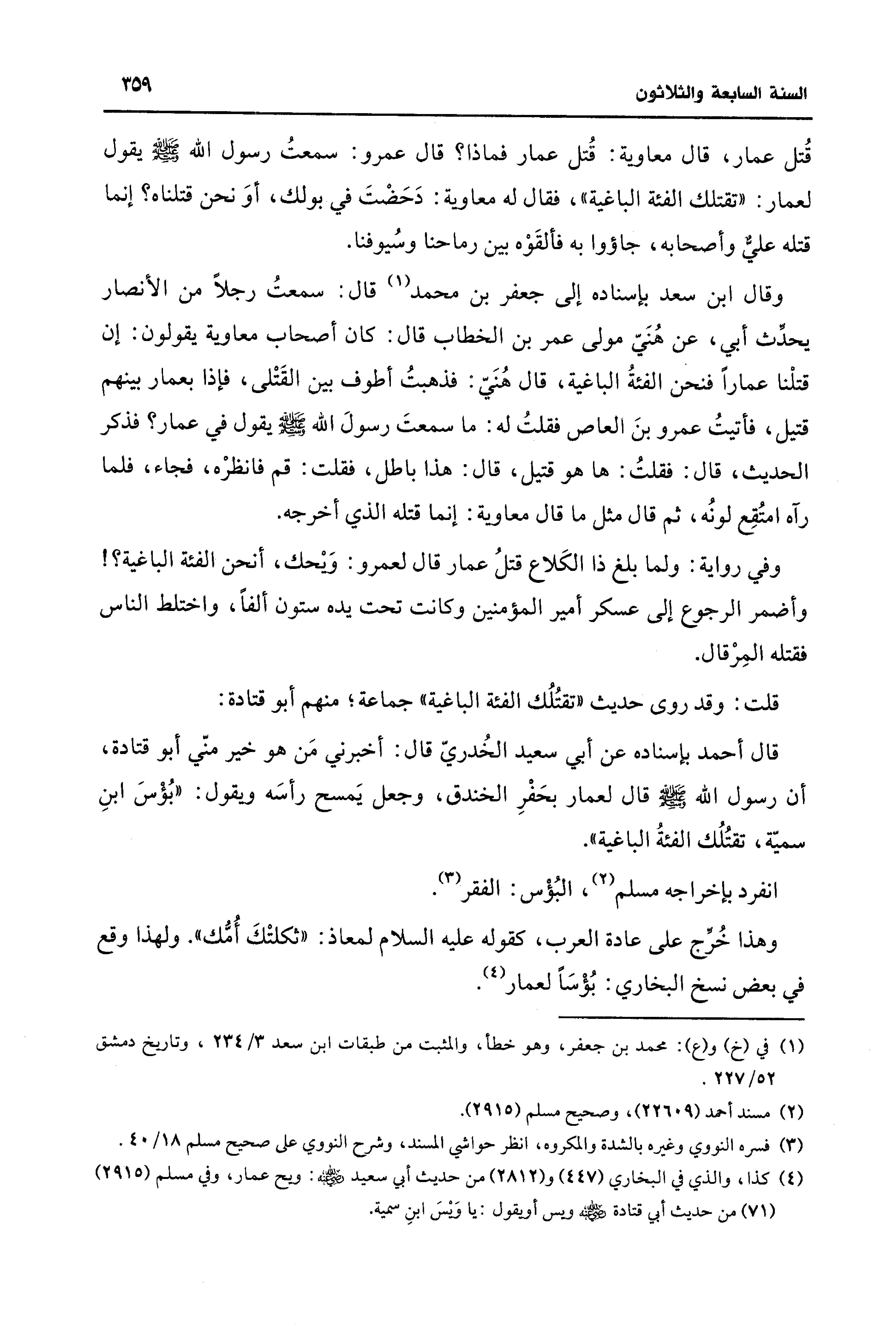 قال أحمد بإسناده عن أبي سعيد الخُدريّ قال: أخبرني مَن هو خير منّي أبو قتادة، أن رسول الله - صلى الله عليه وسلم - قال لعمار بحَفْرِ الخندق، وجعل يَمسح رأسَه ويقول: "بُؤسَ ابنِ سميّة، تقتُلُك الفئةُ الباغية".