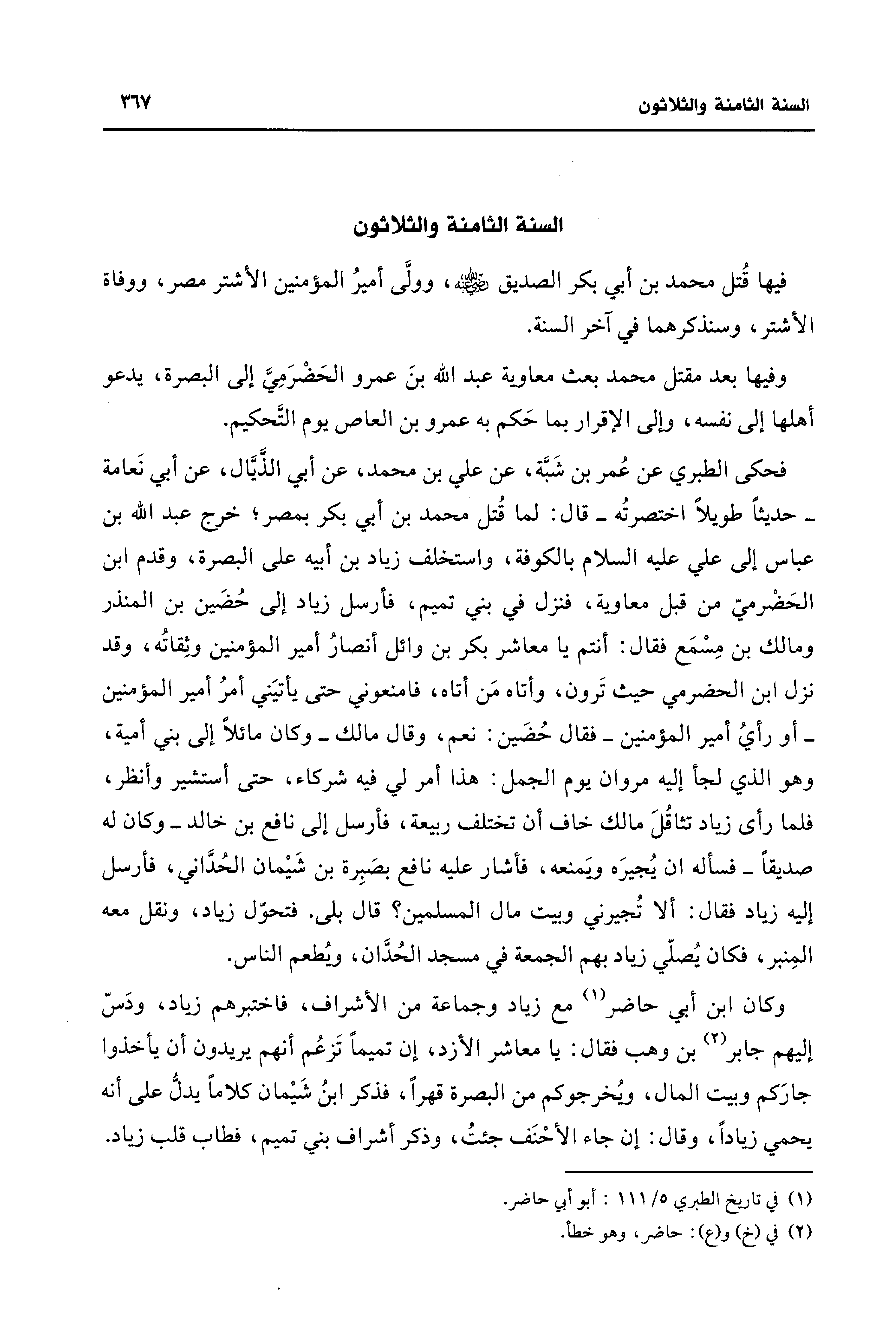 وفيها بعد مقتل محمد بعث معاوية عبد الله بنَ عمرو الحَضْرَمِيَّ إلى البصرة، يدعو أهلها إلى نفسه، وإلى الإقرار بما حَكم به عمرو بن العاص يوم التَّحكيم.
