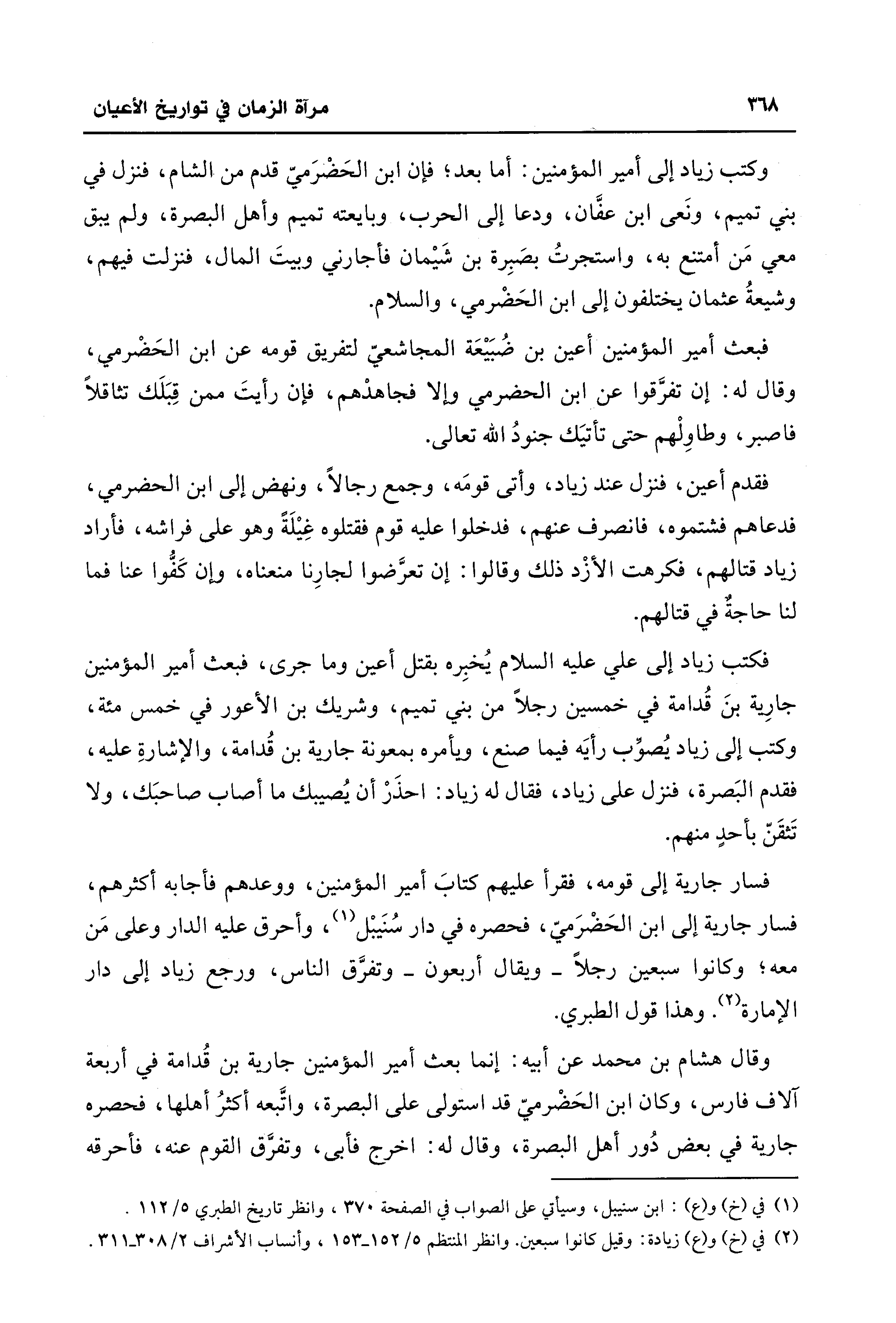 وكتب زياد إلى أمير المؤمنين: أما بعد؛ فإن ابن الحَضْرَميّ قدم من الشام، فنزل في بني تميم، ونَعى ابن عفَّان، ودعا إلى الحرب، وبايعته تميم وأهل البصرة، ولم يبق معي مَن أمتنع به، واستجرتُ بصَبِرة بن شَيمان فأجارني وبيتَ المال، فنزلت فيهم، وشيعةُ عثمان يختلفون إلى ابن الحَضْرمي، والسلام.