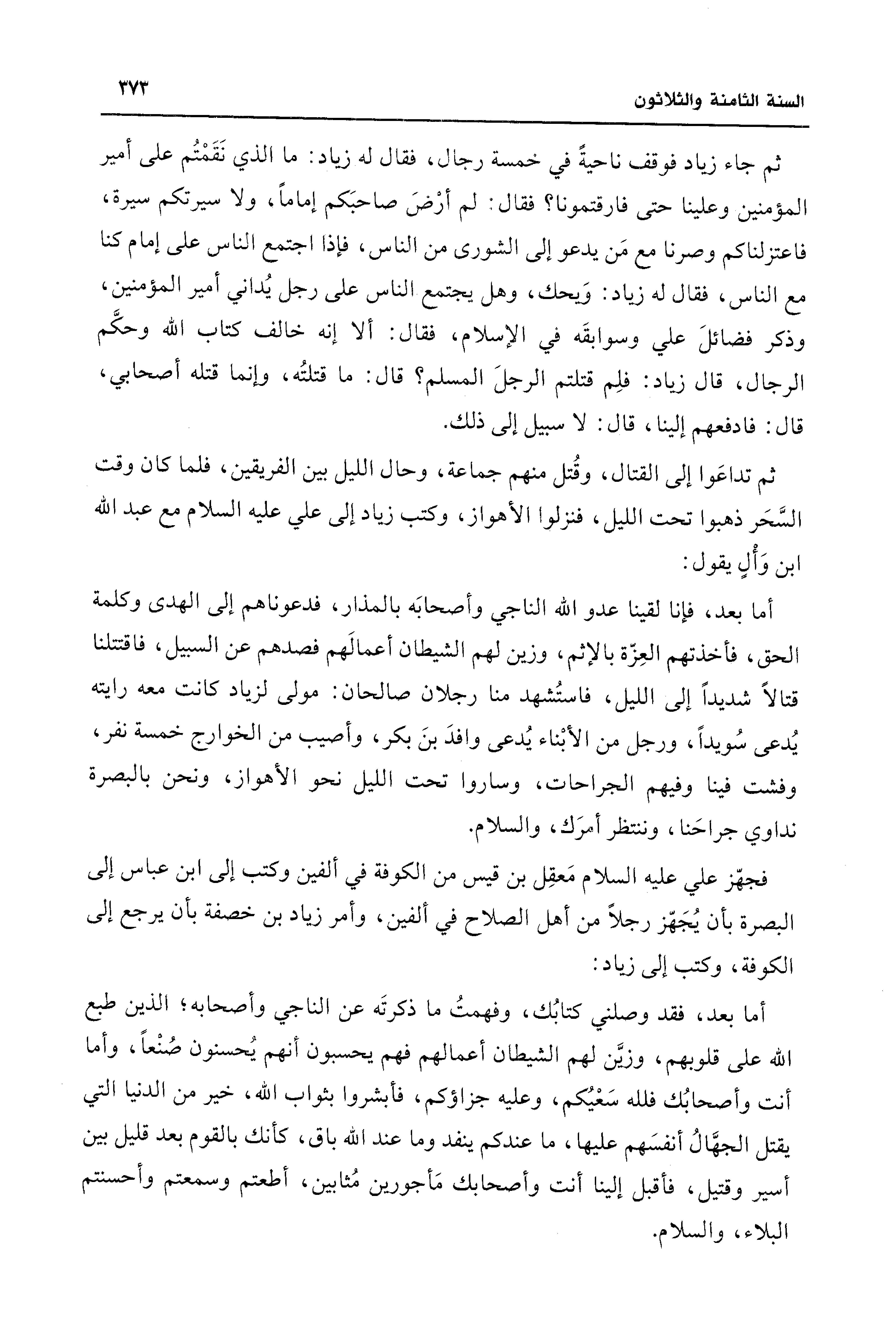 أما بعد، فإنا لقينا عدو الله الناجي وأصحابَه بالمذار، فدعوناهم إلى الهدى وكلمة الحق، فأخذتهم العِزّة بالإثم، وزين لهم الشيطان أعمالهم فصدهم عن السبيل، فاقتتلنا قتالًا شديدًا إلى الليل، فاستُشهد منا رجلان صالحان: مولى لزياد كانت معه رايته يُدعى سُويدًا، ورجل من الأبْناء يُدعى وافدَ بنَ بكر، وأصيب من الخرارج خمسة نفر، وفشت فينا وفيهم الجراحات، وساروا تحت الليل نحو الأهواز، ونحن بالبصرة نداوي جراحَنا، وننتظر أمرَك، والسلام.