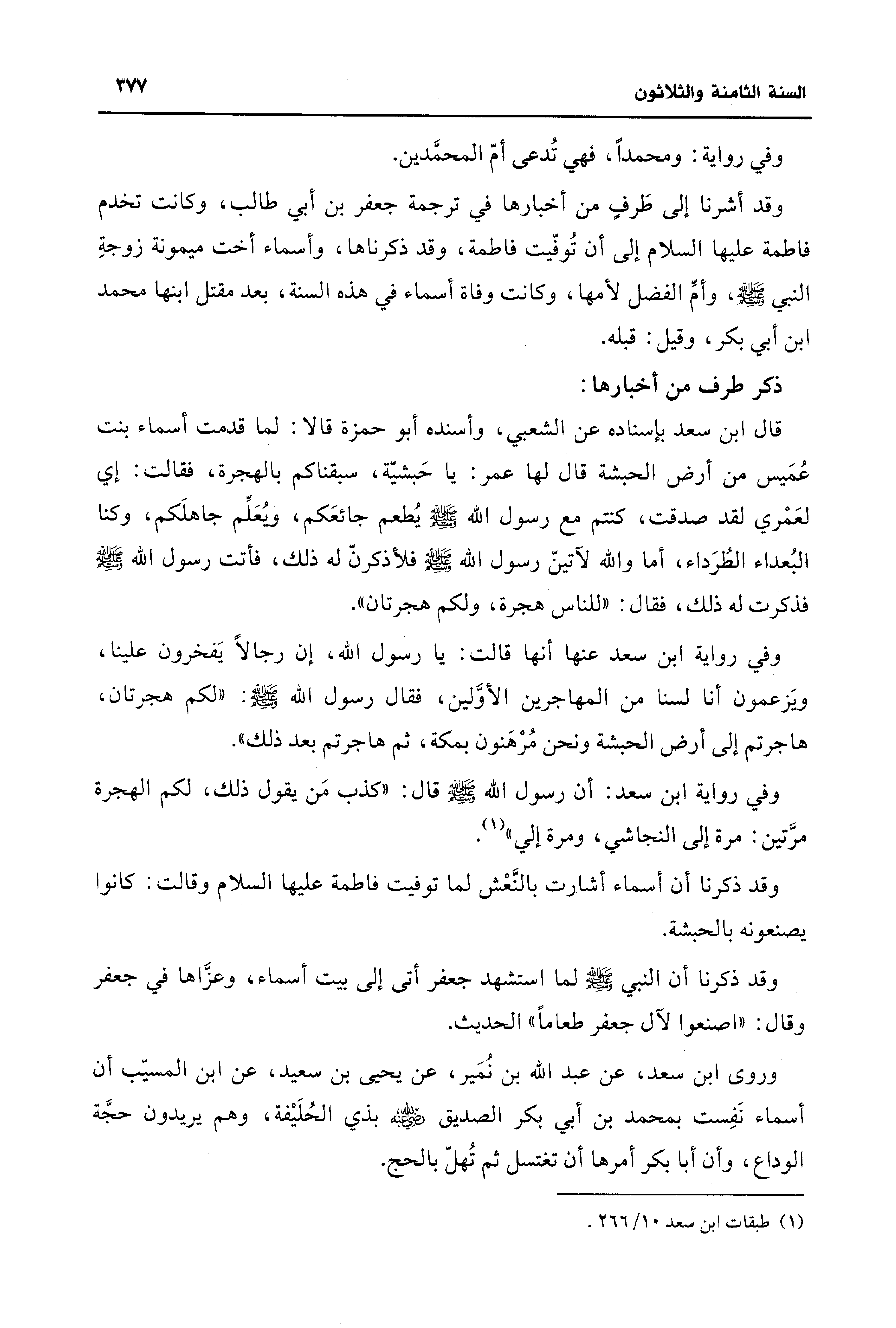 قال ابن سعد بإسناده عن الشعبي، وأسنده أبو حمزة قالا: لما قدمت أسماء بنت عُمَيس من أرض الحبشة قال لها عمر: يا حَبشيّة، سبقناكم بالهجرة، فقالت: إي لعَمْري لقد صدقت، كنتم مع رسول الله - صلى الله عليه وسلم - يُطعم جائعَكم، ويُعَلِّم جاهلَكم، وكنا البُعداء الطُرَداء، أما والله لآتينّ رسول الله - صلى الله عليه وسلم - فلأذكرنّ له ذلك، فأتت رسول الله - صلى الله عليه وسلم - فذكرت له ذلك، فقال: "للناس هجرة، ولكم هجرتان".