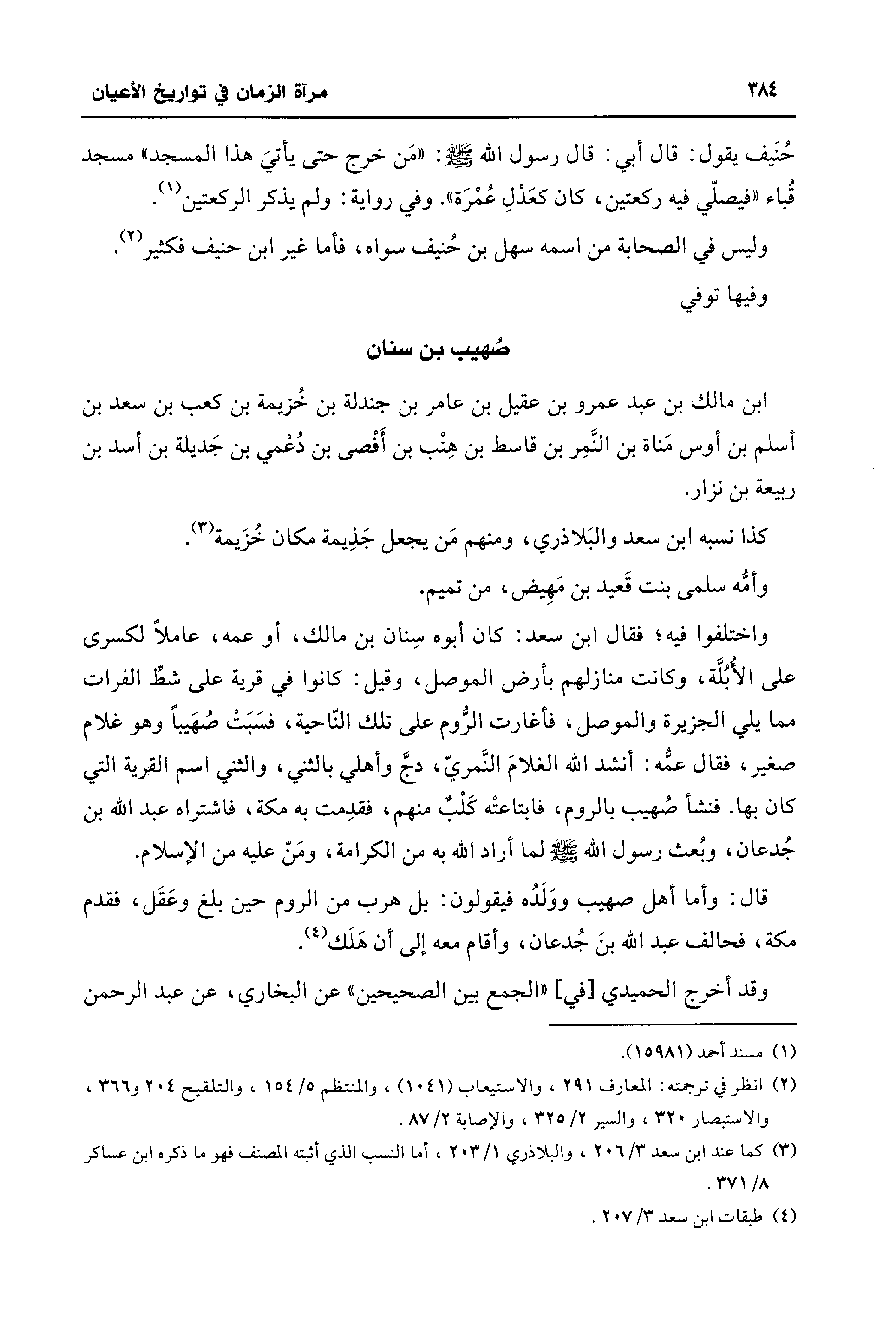قال: وأما أهل صهيب ووَلَدُه فيقولون: بل هرب من الروم حين بلغ وعَقَل، فقدم مكة، فحالف عبد الله بنَ جُدعان، وأقام معه إلى أن هَلَك (¬4).