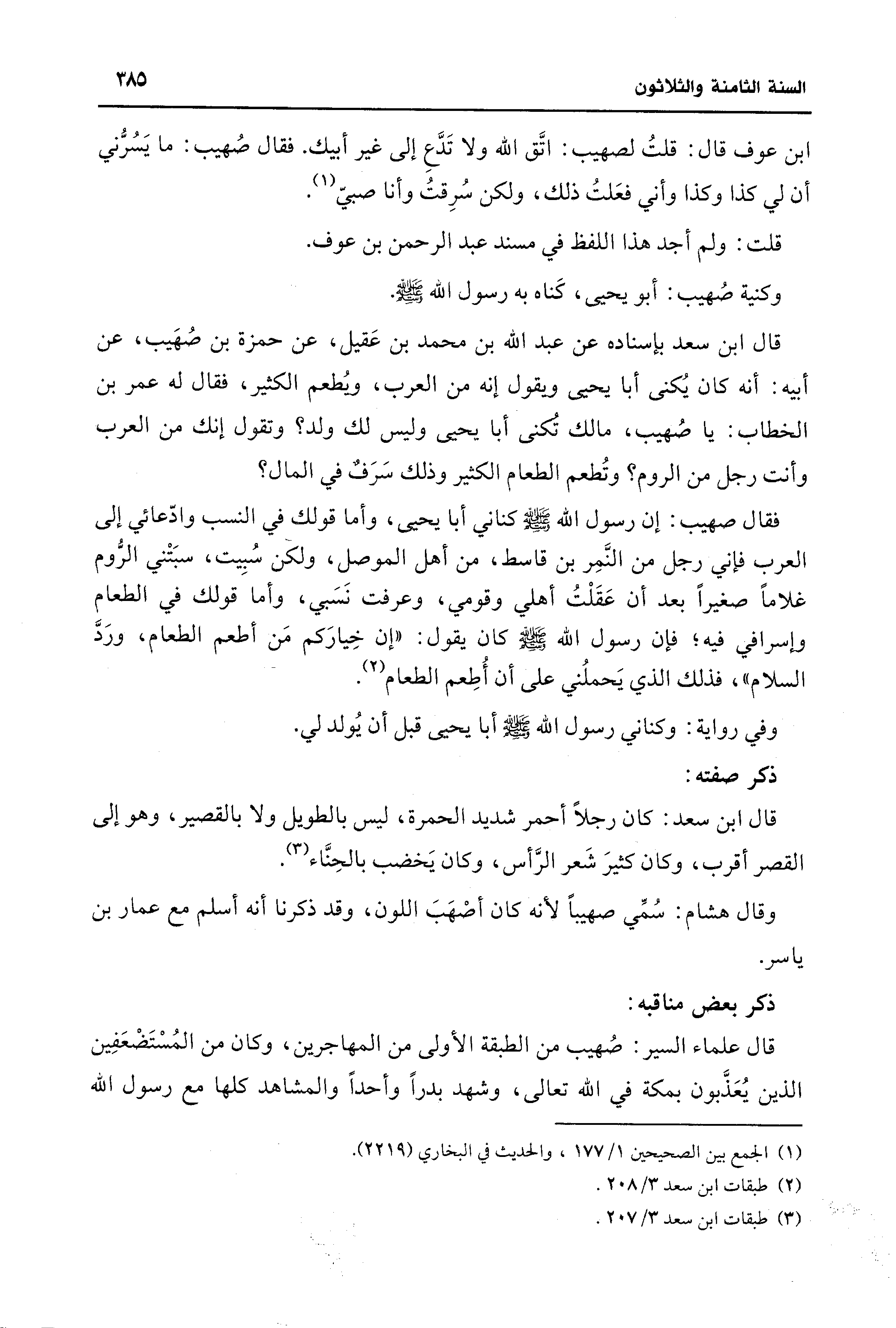 فقال صهيب: إن رسول الله - صلى الله عليه وسلم - كناني أبا يحيى، وأما قولك في النسب وادّعائي إلى العرب فإني رجل من النَّمِر بن قاسط، من أهل الموصل، ولكن سُبِيت، سبَتْني الرُّوم غلامًا صغيرًا بَعد أن عَقَلْتُ أهلي وقومي، وعرفت نَسَبي، وأما قولك في الطعام وإسرافي فيه؛ فإن رسول الله - صلى الله عليه وسلم - كان يقول: "إن خِيارَكم مَن أطعم الطعام، ورَدَّ السلام"، فذلك الَّذي يَحملُني على أن أُطِعم الطعام (¬2).