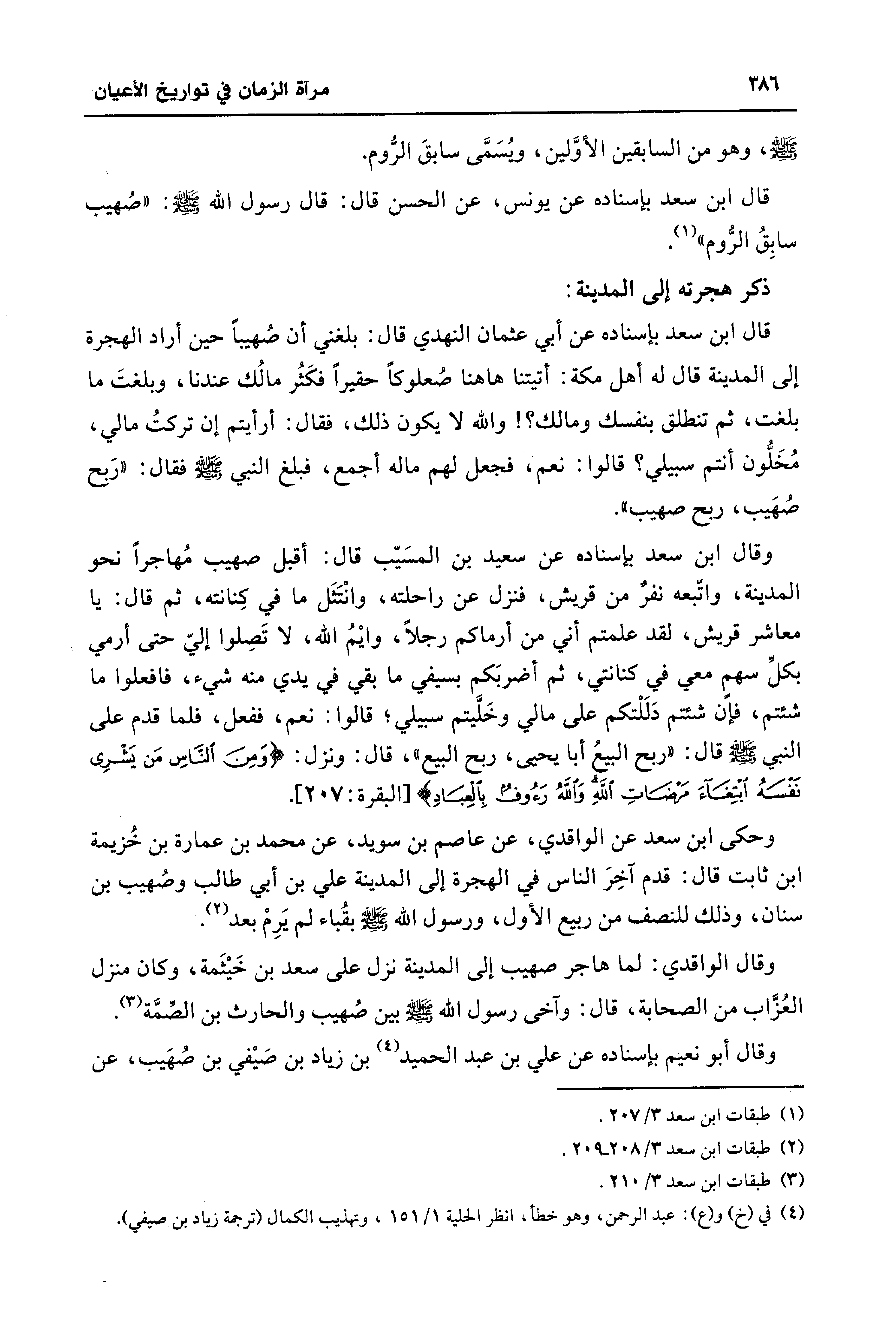 وقال ابن سعد بإسناده عن سعيد بن المسَيّب قال: أقبل صهيب مُهاجرًا نحو المدينة، واتّبعه نفرٌ من قريش، فنزل عن راحلته، وانْتَثَل ما في كِنانته، ثم قال: يا معاشر قريش، لقد علمتم أني من أرماكم رجلًا، وايمُ الله، لا تَصِلوا إليّ حتَّى أرمي بكلِّ سهمٍ معي في كنانتي، ثم أضربَكم بسيفي ما بقي في يدي منه شيء، فافعلوا ما شئتم، فإن شئتم دَلَلْتكم على مالي وخَلَّيتم سبيلي؛ قالوا: نعم، ففعل، فلما قدم على النبي - صلى الله عليه وسلم - قال: "ربح البيعُ أبا يحيى، ربح البيع"، قال: ونزل: {وَمِنَ النَّاسِ مَنْ يَشْرِي نَفْسَهُ ابْتِغَاءَ مَرْضَاتِ اللَّهِ وَاللَّهُ رَءُوفٌ بِالْعِبَادِ} [البقرة: 207].