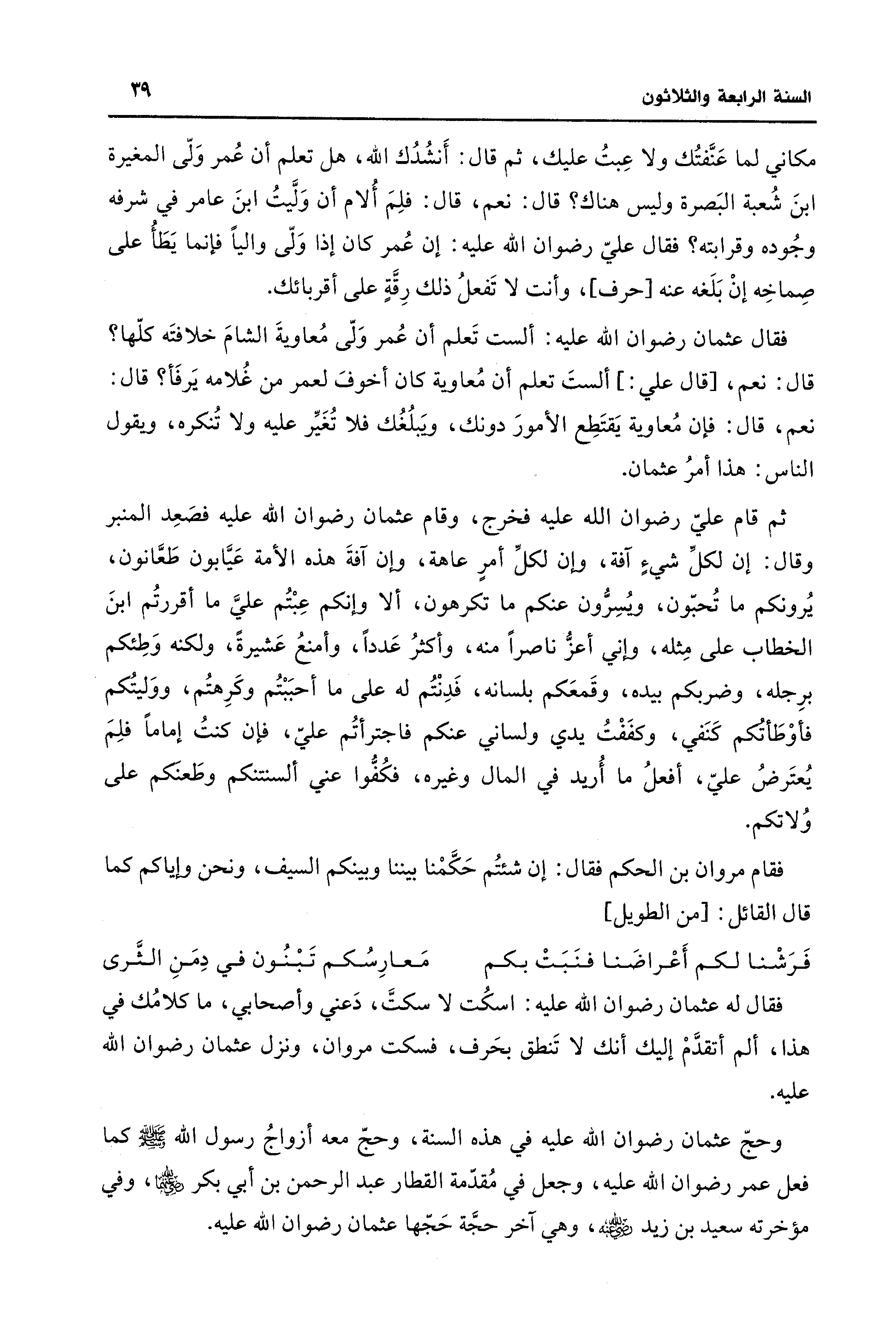 ثم قام عليّ رضوان الله عليه فخرج، وقام عثمان رضوان الله عليه فصَعِد المنبر وقال: إن لكلِّ شيءٍ آفة، وإن لكلِّ أمرٍ عاهة، وإن افةَ هذه الأمة عَيَّابون طَعَّانون، يُرونكم ما تُحبّون، ويُسِرُّون عنكم ما تكرهون، ألا وإنكم عِبْتُم عليَّ ما أقررتُم ابنَ الخطاب على مِثله، وإني أعزُّ ناصرًا منه، وأكثرُ عَددًا، وأمنعُ عَشيرةً، ولكنه وَطِئكم برِجله، وضربكم بيده، وقَمعَكم بلسانه، فَدِنْتُم له على ما أحبَبْتُم وكَرِهتُم، ووَليتُكم فأوْطَأتكم كَنَفي، وكفَفْتُ يدي ولساني عنكم فاجترأتُم عليّ، فإن كنتُ إمامًا فلِمَ يُعتَرضُ عليّ، أفعلُ ما أُريد في المال وغيره، فكُفّوا عني ألسنتنكم وطَعنكم على وُلاتكم.