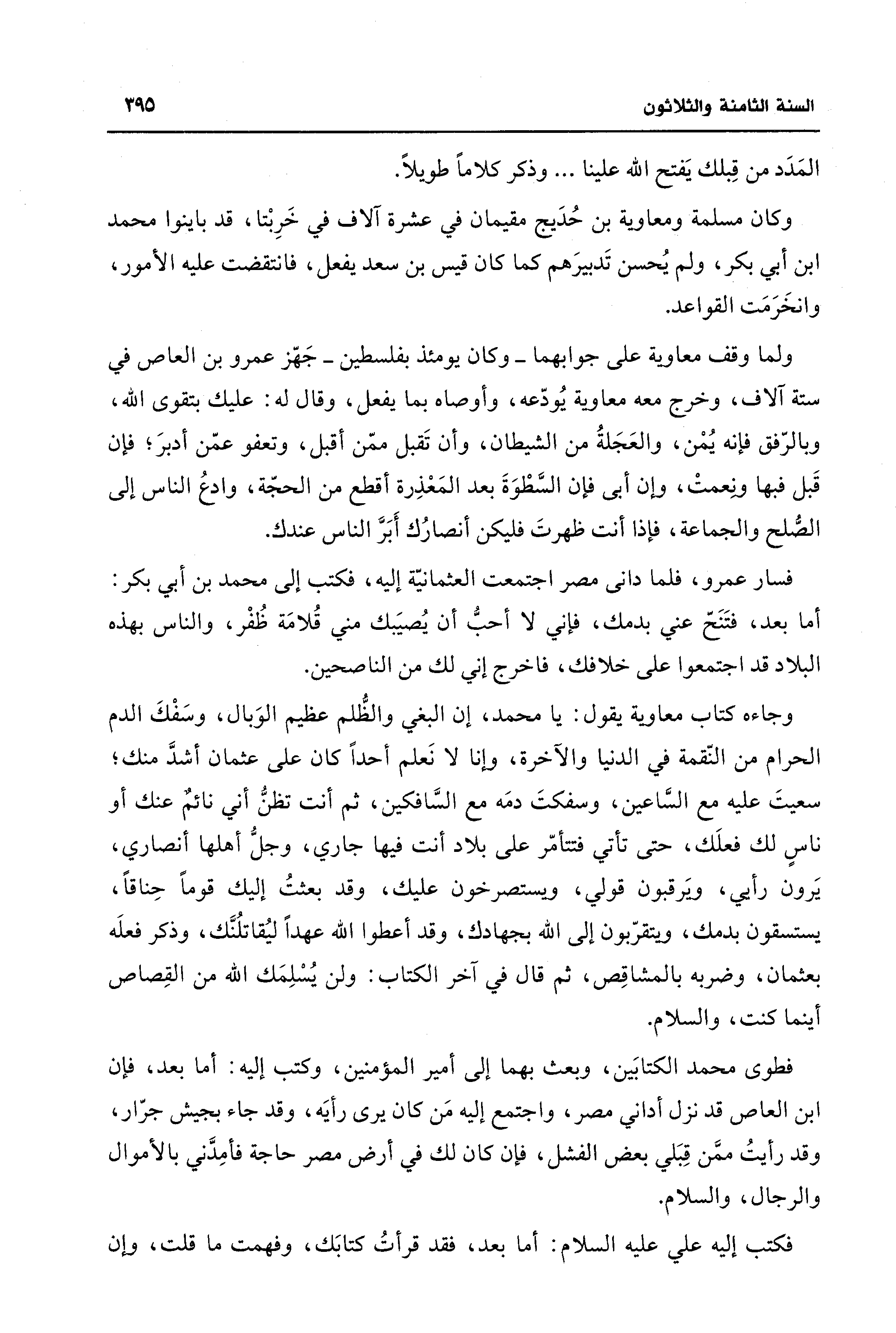 فطوى محمد الكتابَين، وبعث بهما إلى أمير المؤمنين، وكتب إليه: أما بعد، فإن ابن العاص قد نزل أداني مصر، واجتمع إليه مَن كان يرى رأيَه، وقد جاء بجيش جرّار، وقد رأيتُ ممَّن قِبَلي بعض الفشل، فإن كان لك في أرض مصر حاجة فأمِدَّني بالأموال والرجال، والسلام.