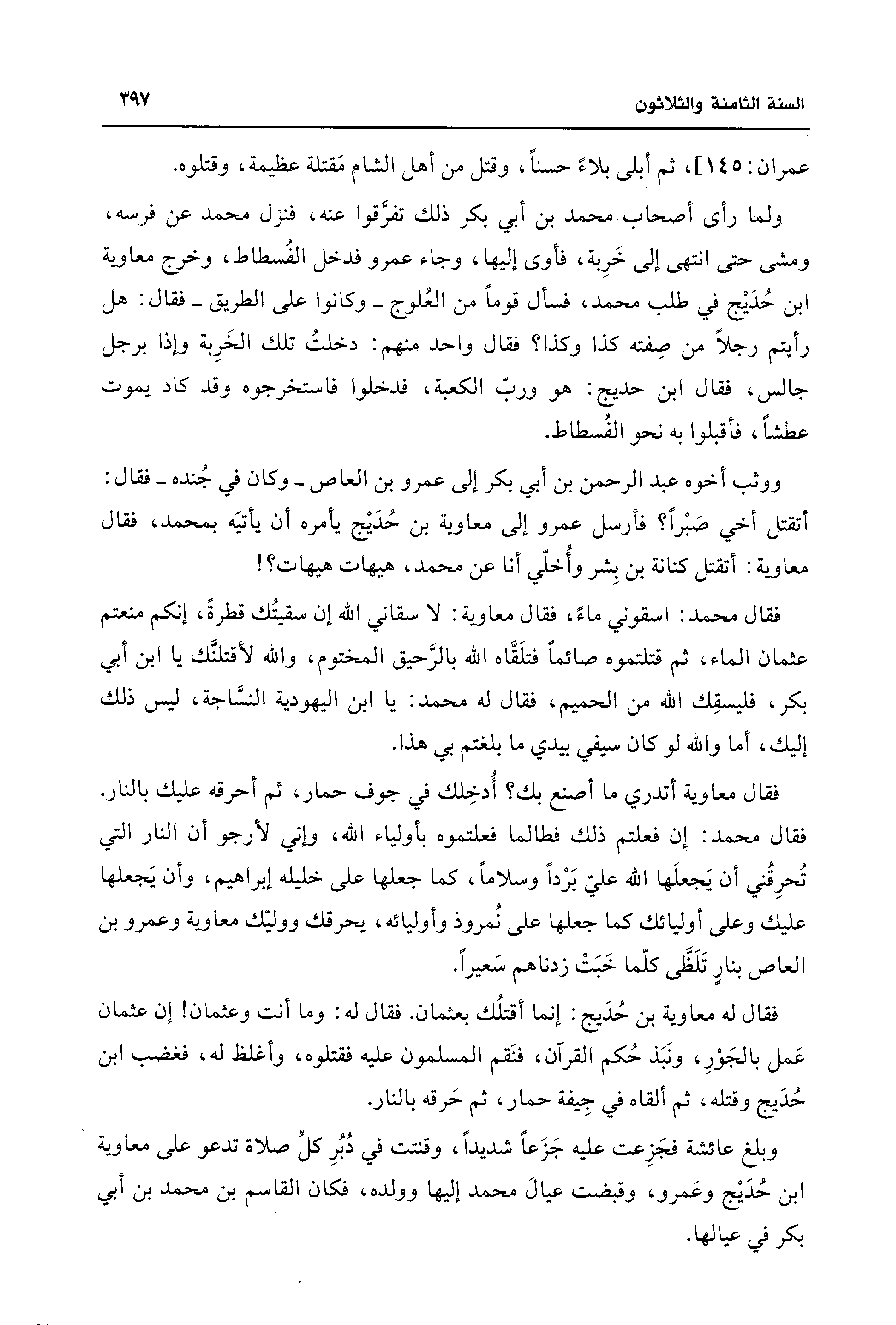 فقال محمد: اسقوني ماءً، فقال معاوية: لا سقاني الله إن سقيتُك قطرةً، إنكم منعتم عثمان الماء، ثم قتلتموه صائمًا فتلَقَّاه الله بالرَّحيق المختوم، والله لأقتلنَّك يا ابن أبي بكر، فليسقِك الله من الحميم، فقال له محمد: يا ابن اليهودية النسَّاجة، ليس ذلك إليك، أما والله لو كان سيفي بيدي ما بلغتم بي هذا.