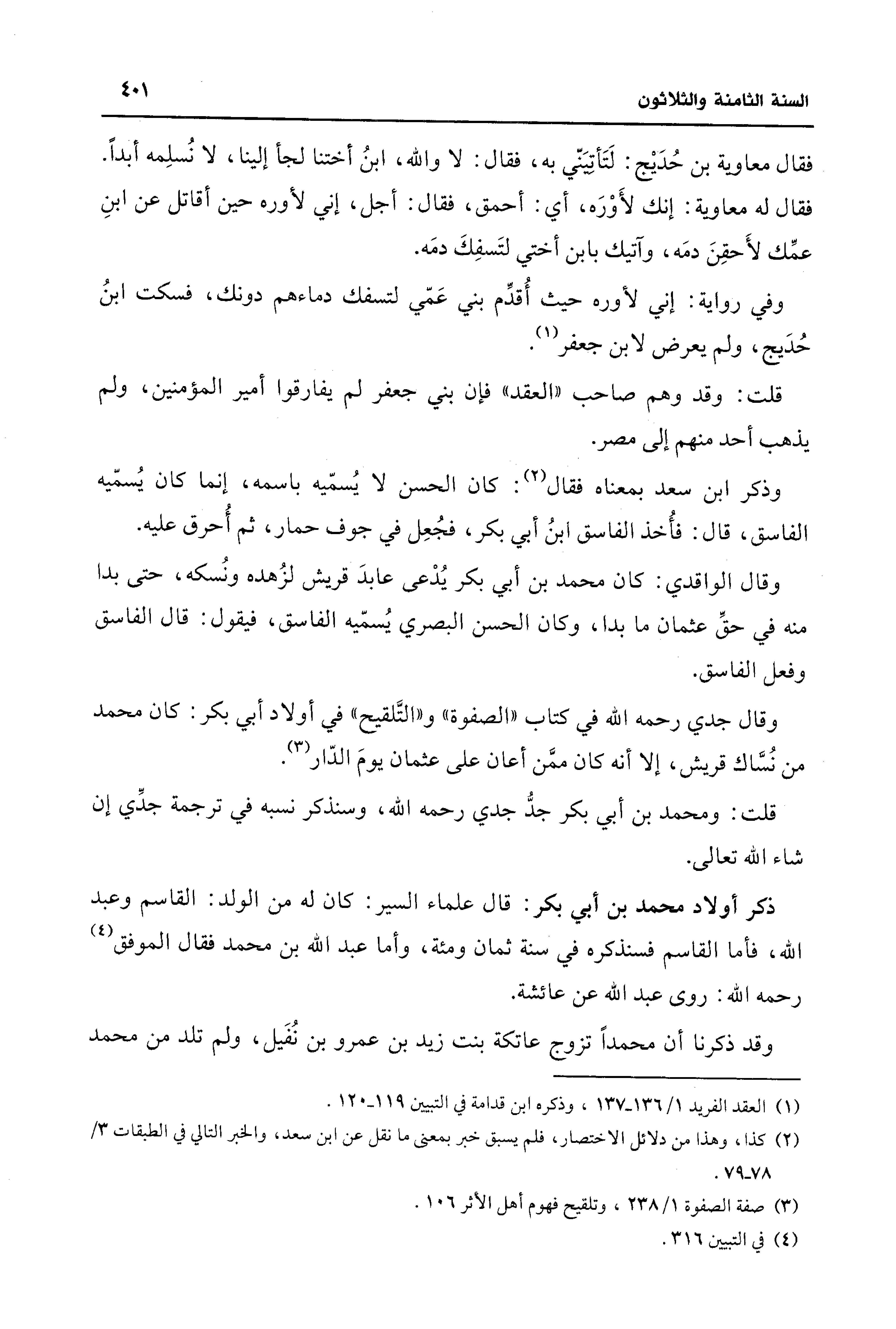 وقال جدي رحمه الله في كتاب "الصفوة" و"التَّلقيح" في أولاد أبي بكر: كان محمد من نُسَّاك قريش، إلا أنَّه كان ممَّن أعان على عثمان يومَ الدّار (¬3).