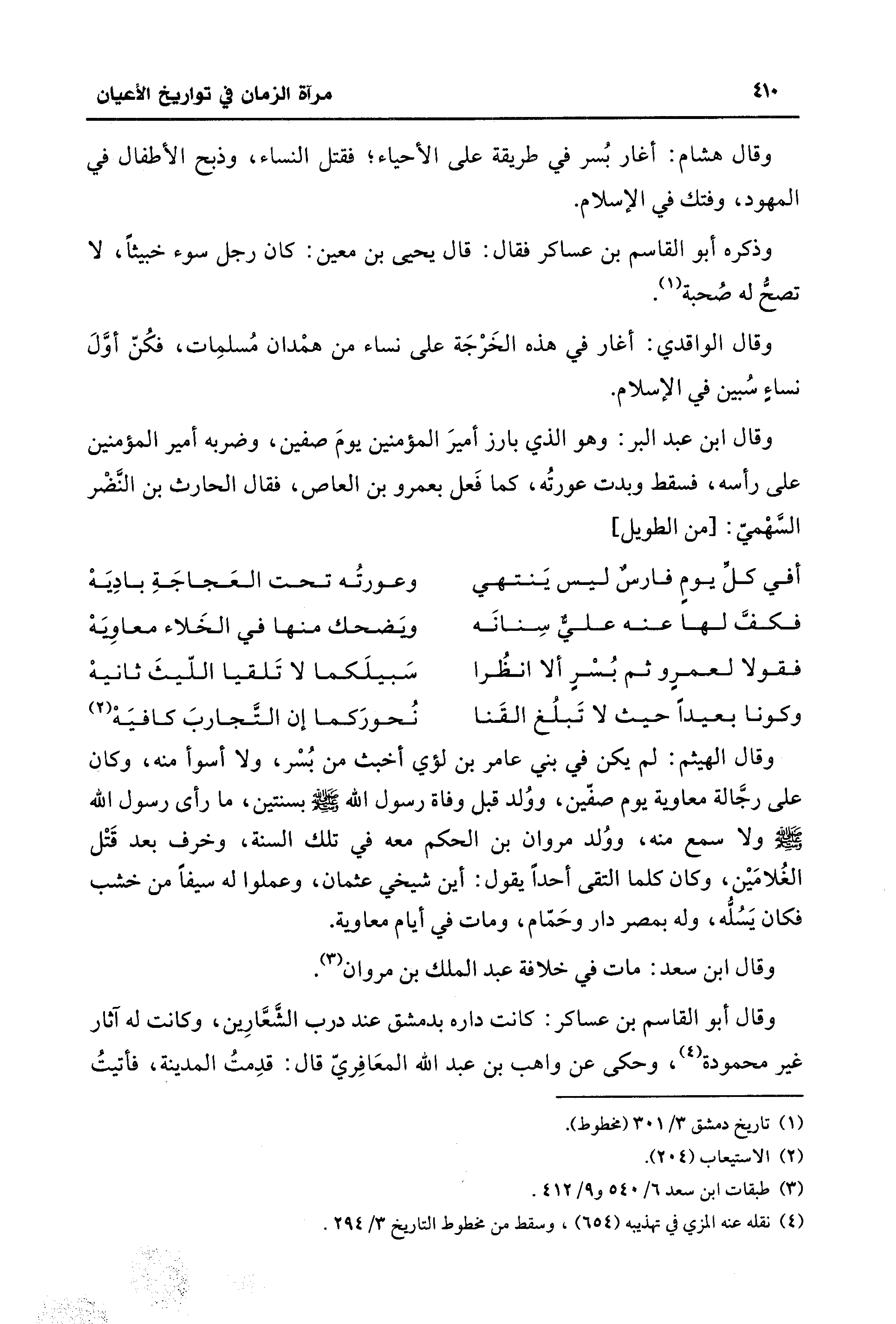 وقال هشام: أغار بُسر في طريقة على الأحياء؛ فقتل النساء، وذبح الأطفال في المهود، وفتك في الإسلام.
