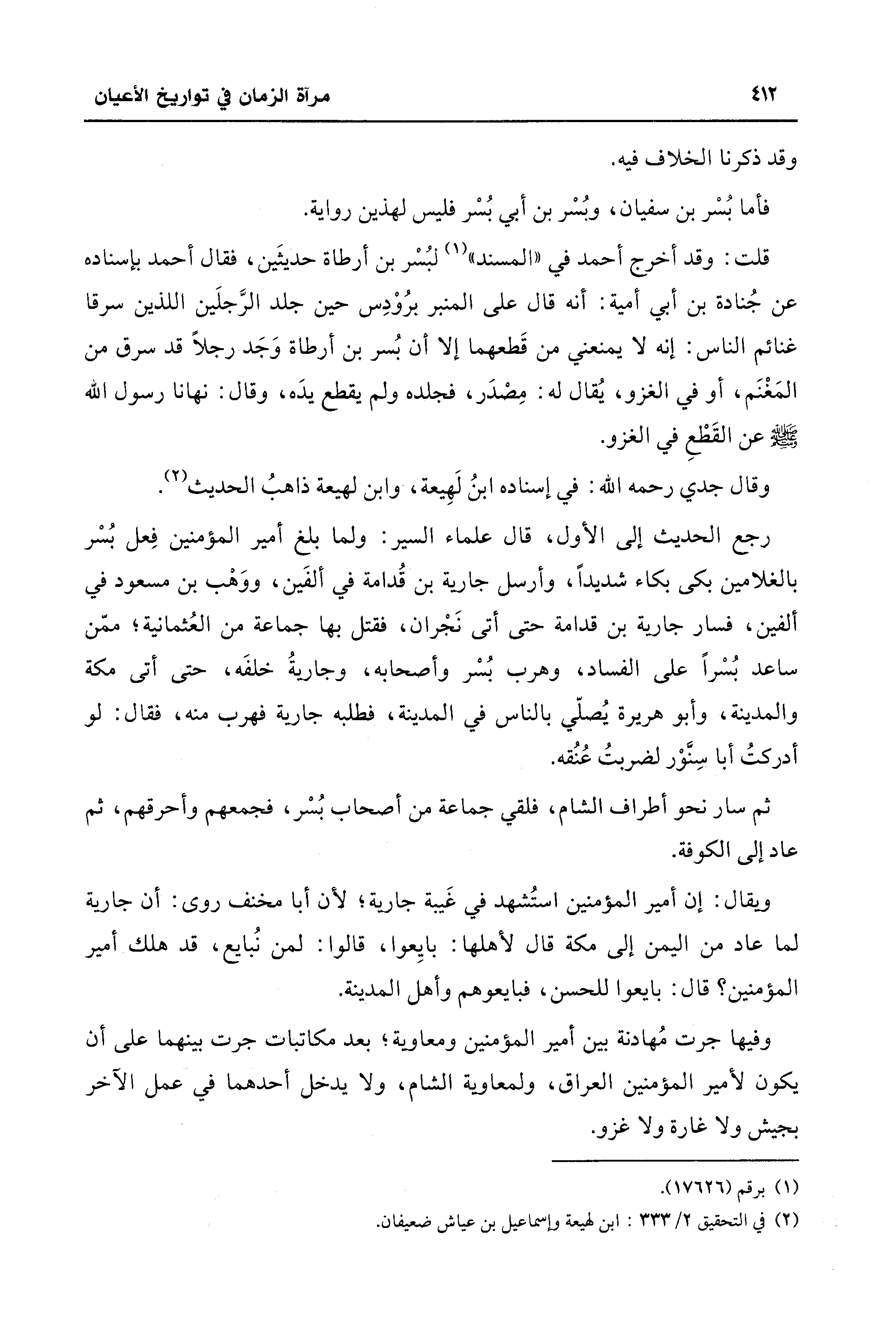 قلت: وقد أخرج أحمد في "المسند" (¬1) لبُسْر بن أرطاة حديثَين، فقال أحمد بإسناده عن جُنادة بن أبي أمية: أنَّه قال على المنبر برُوْدِس حين جلد الرَّجلَين اللذين سرقا غنائم الناس: إنه لا يمنعني من قَطعهما إلا أن بُسر بن أرطاة وَجَد رجلًا قد سرق من المَغْنَم، أو في الغزو، يُقال له: مِصْدَر، فجلده ولم يقطع يدَه، وقال: نهانا رسول الله - صلى الله عليه وسلم - عن القَطْعِ في الغزو.