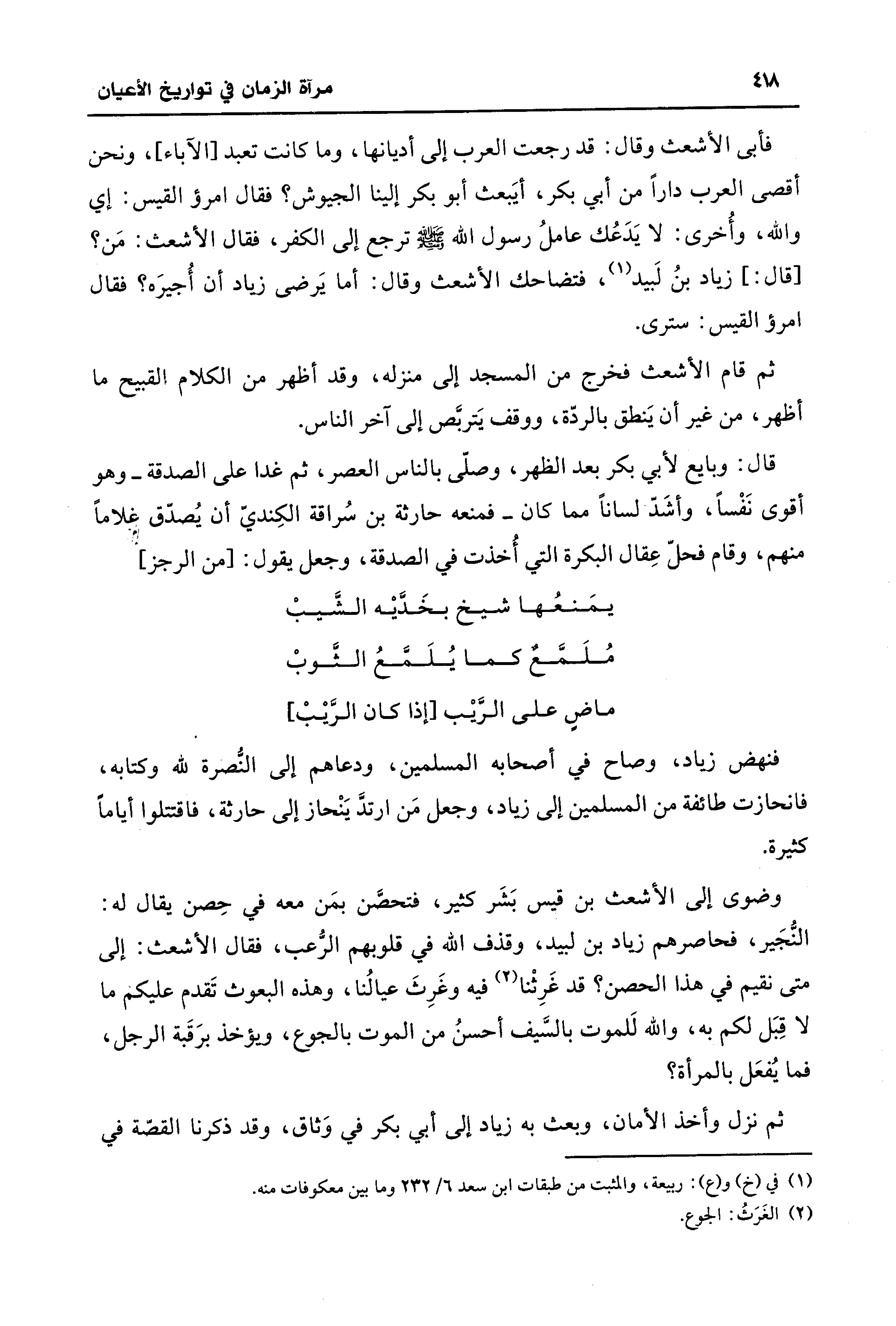 قال: وبايع لأبي بكر بعد الظهر، وصلّى بالناس العصر، ثم غدا على الصدقة -وهو أقوى نَفْسًا، وأشَدّ لسانًا مما كان- فمنعه حارثة بن سُراقة الكِنديّ أن يُصدّق غلامًا منهم، وقام فحلّ عِقال البكرة التي أُخذت في الصدقة، وجعل يقول: [من الرجز]