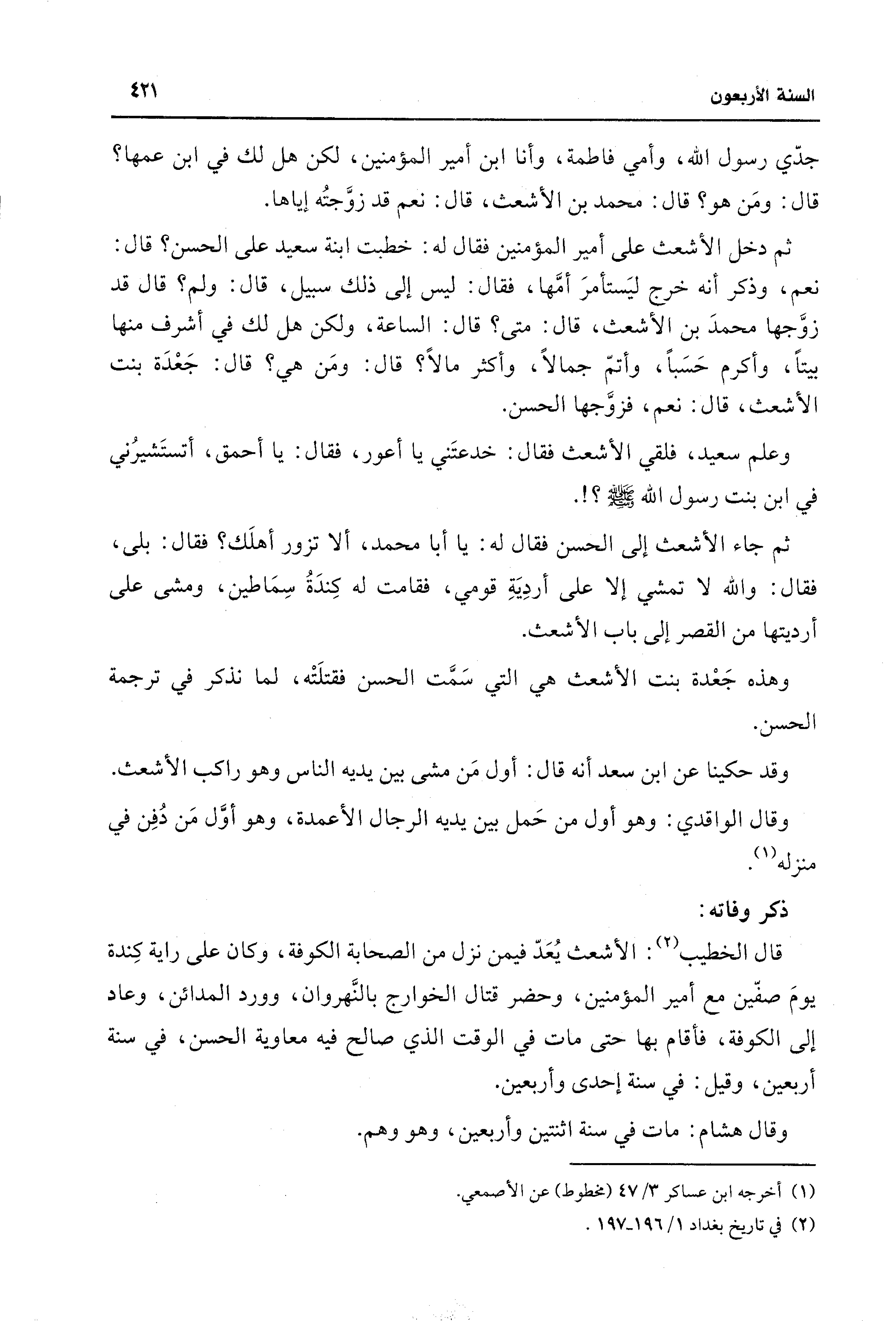 قال الخطيب (¬2): الأشعث يُعَدّ فيمن نزل من الصحابة الكوفة، وكان على راية كِندة يومَ صفّين مع أمير المؤمنين، وحضر قتال الخوارج بالنَّهروان، وورد المدائن، وعاد إلى الكوفة، فأقام بها حتى مات في الوقت الذي صالح فيه معاوية الحسن، في سنة أربعين، وقيل: في سنة إحدى وأربعين.