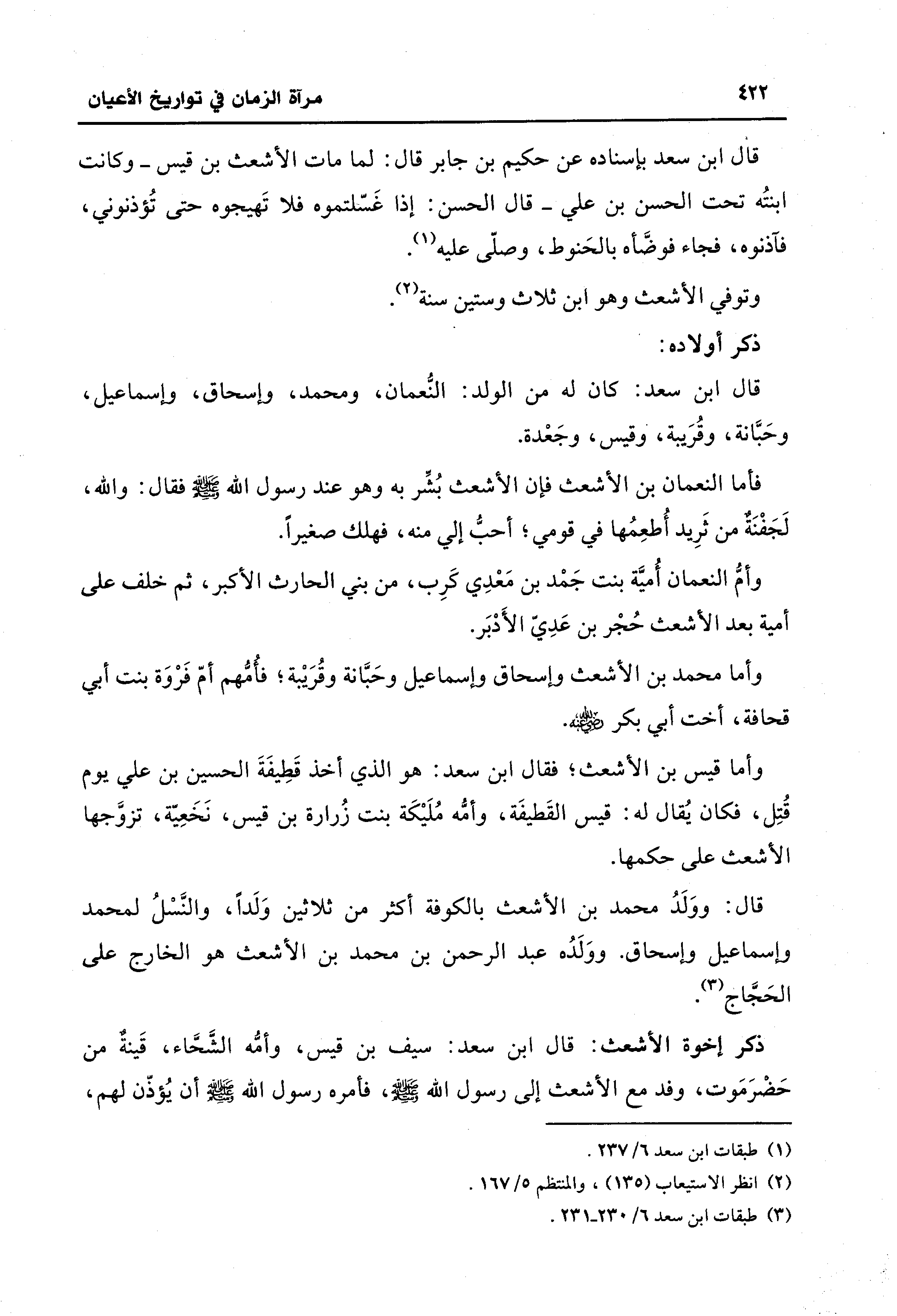 قال: ووَلَدُ محمد بن الأشعث بالكوفة أكثر من ثلاثين وَلَدًا، والنَّسْلُ لمحمد وإسماعيل وإسحاق. ووَلَدُه عبد الرحمن بن محمد بن الأشعث هو الخارج على الحَجَّاج (¬3).