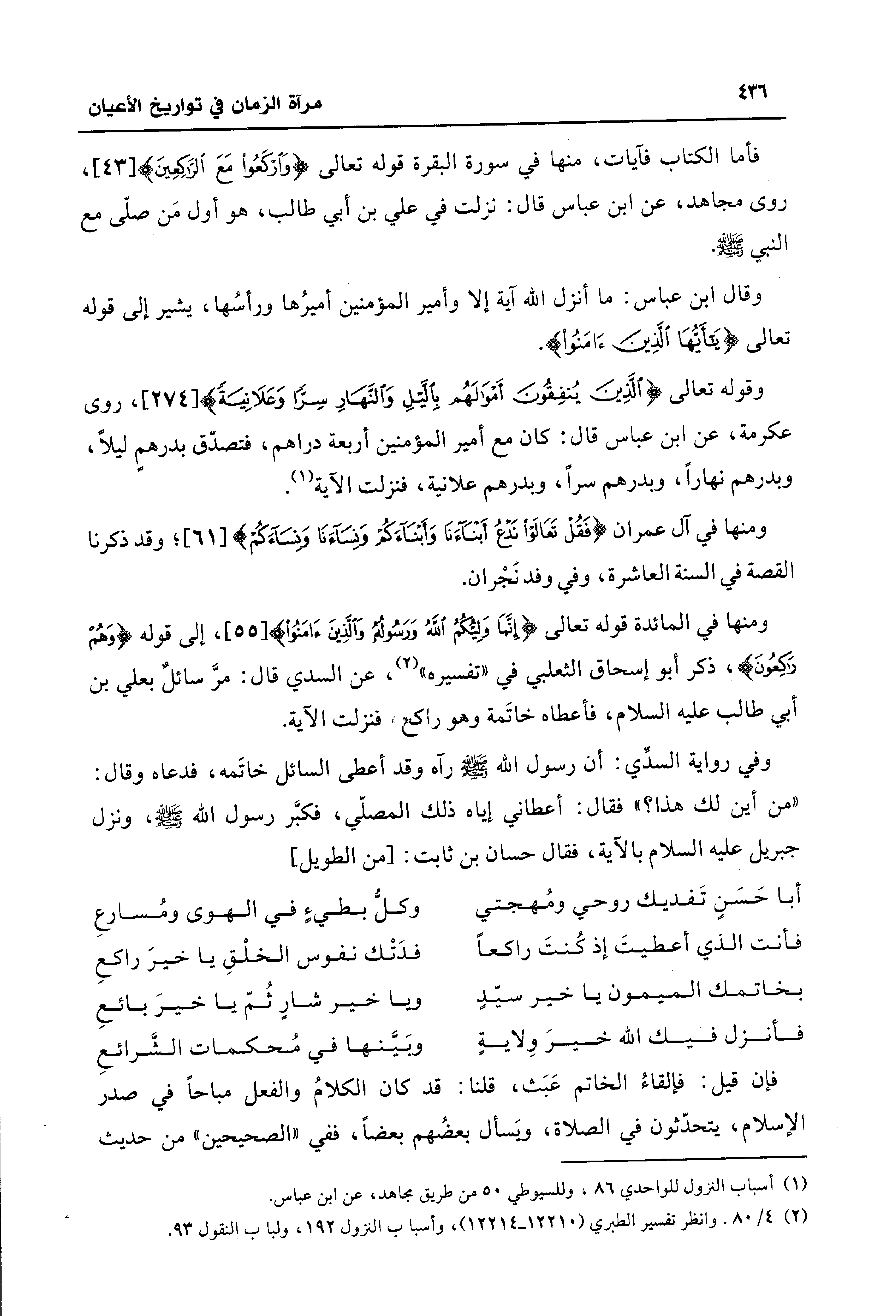 ومنها في المائدة قوله تعالى {إِنَّمَا وَلِيُّكُمُ اللَّهُ وَرَسُولُهُ وَالَّذِينَ آمَنُوا} [55]، إلى قوله {وَهُمْ رَاكِعُونَ}، ذكر أبو إسحاق الثعلبي في تفسيره" (¬2)، عن السدي قال: مرَّ سائلٌ بعلي بن أبي طالب - عليه السلام -، فأعطاه خاتَمة وهو راكع، فنزلت الآية.