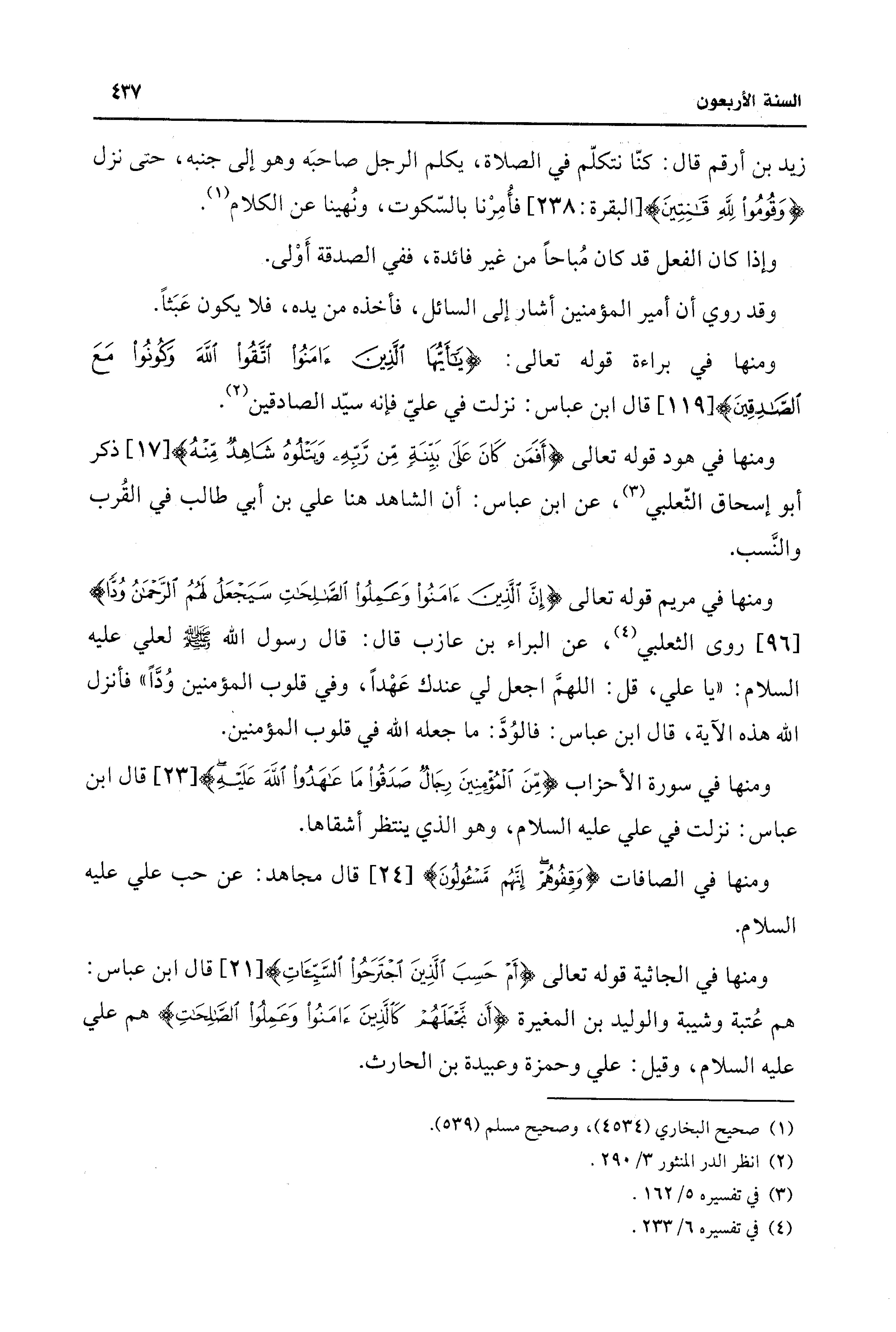 زيد بن أرقم قال: كنّا نتكلّم في الصلاة، يكلم الرجل صاحبّه وهو إلى جنبه، حتى نزل {وَقُومُوا لِلَّهِ قَانِتِينَ} [البقرة: 238] فأمِرْنا بالسّكوت، ونُهينًا عن الكلام (¬1).
