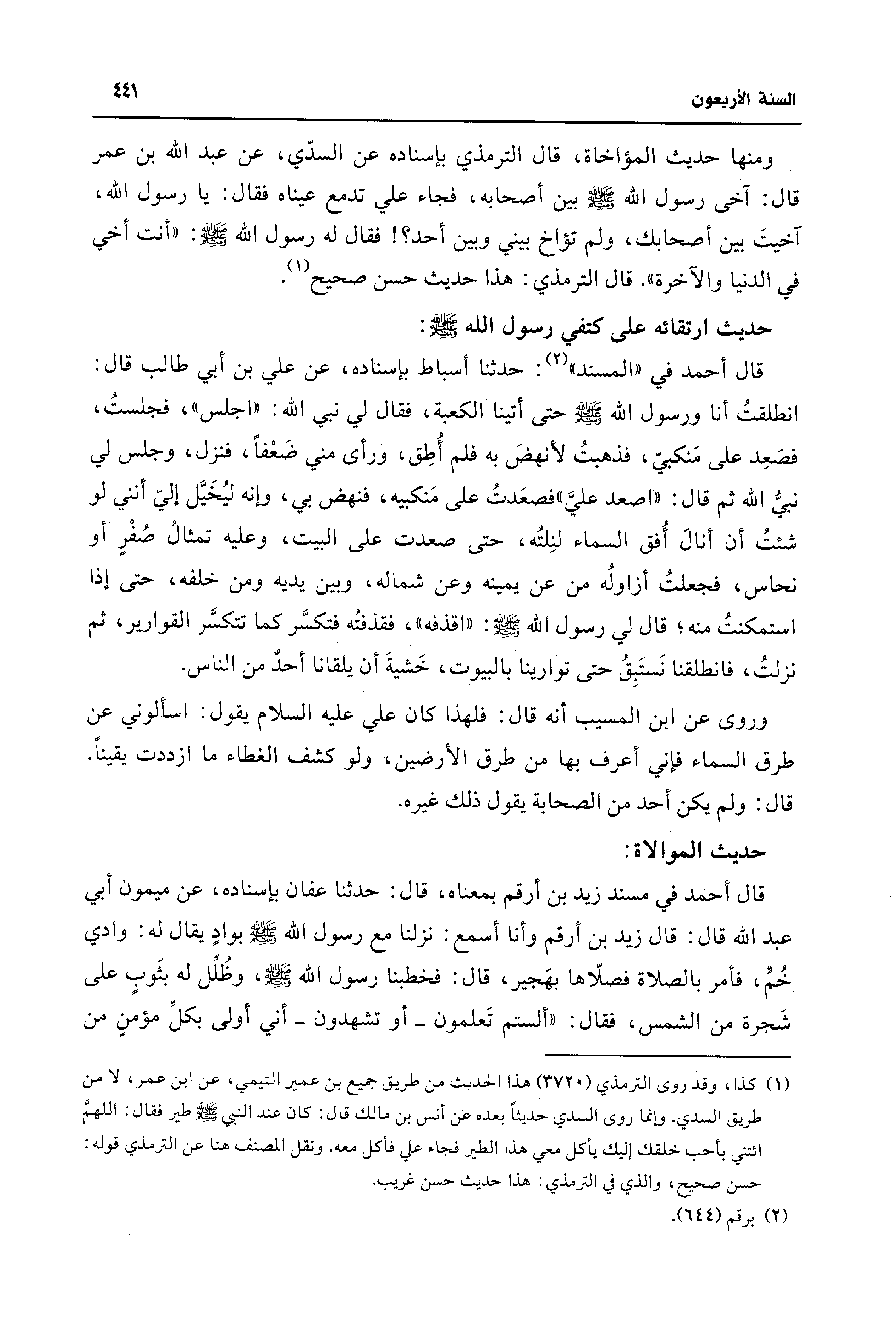 ومنها حديث المؤاخاة، قال الترمذي بإسناده عن السدّي، عن عبد الله بن عمر قال: آخى رسول اللهِ - صلى الله عليه وسلم - بين أصحابه، فجاء علي تدمع عيناه فقال: يا رسول الله، آخيتَ بين أصحابك، ولم تؤاخ بيني وبين أحد؟ ! فقال له رسول الله - صلى الله عليه وسلم -: "أنت أخي في الدنيا والآخرة". قال الترمذي: هذا حديث حسن صحيح (¬1).