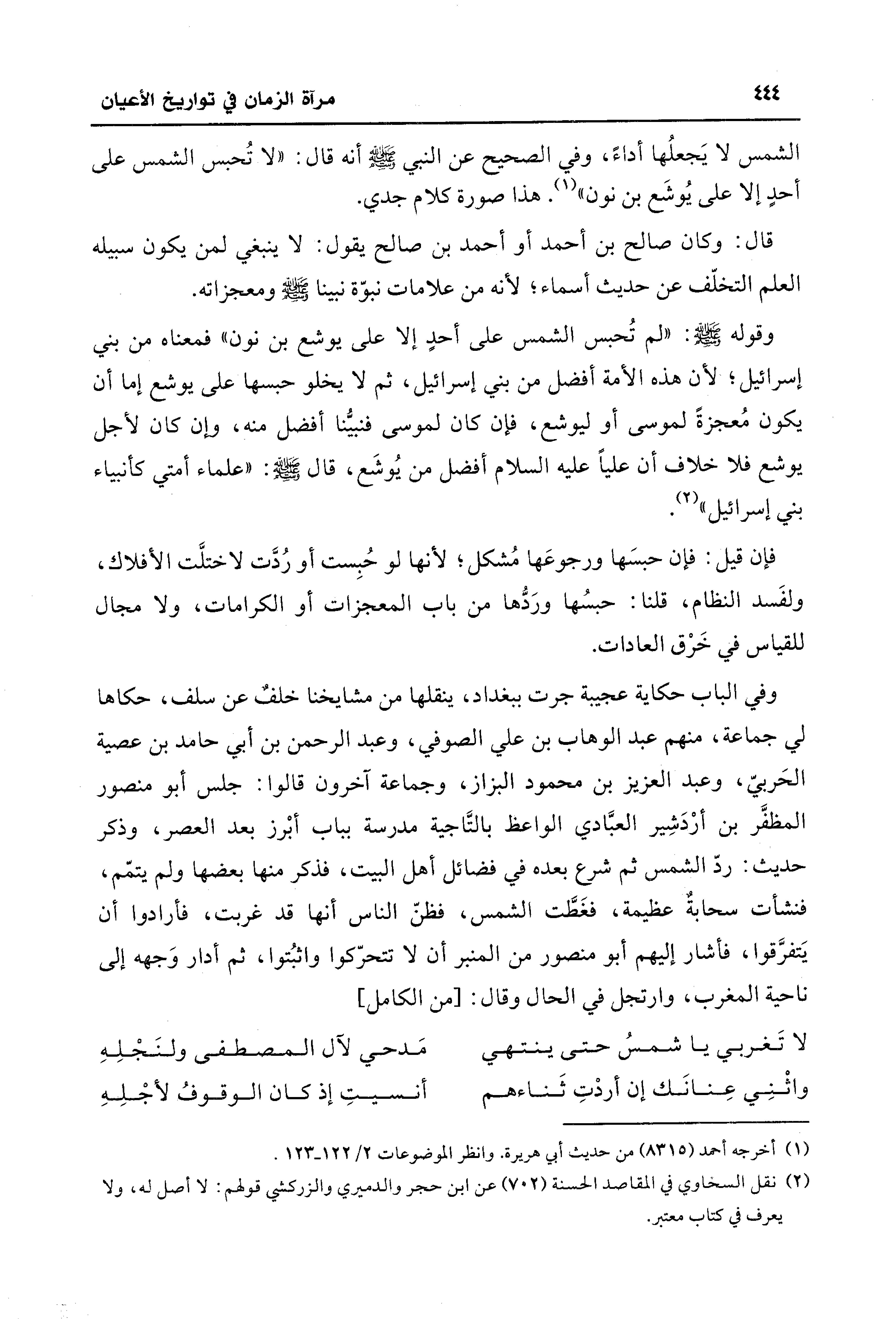 فإن قيل: فإن حبسَها ورجوعَها مُشكل؛ لأنها لو حُبِست أو رُدِّت لاختلَّت الأفلاك، ولفَسد النظام، قلنا: حبسُها ورَدُّها من باب المعجزات أو الكرامات، ولا مجال للقياس في خَرْق العادات.