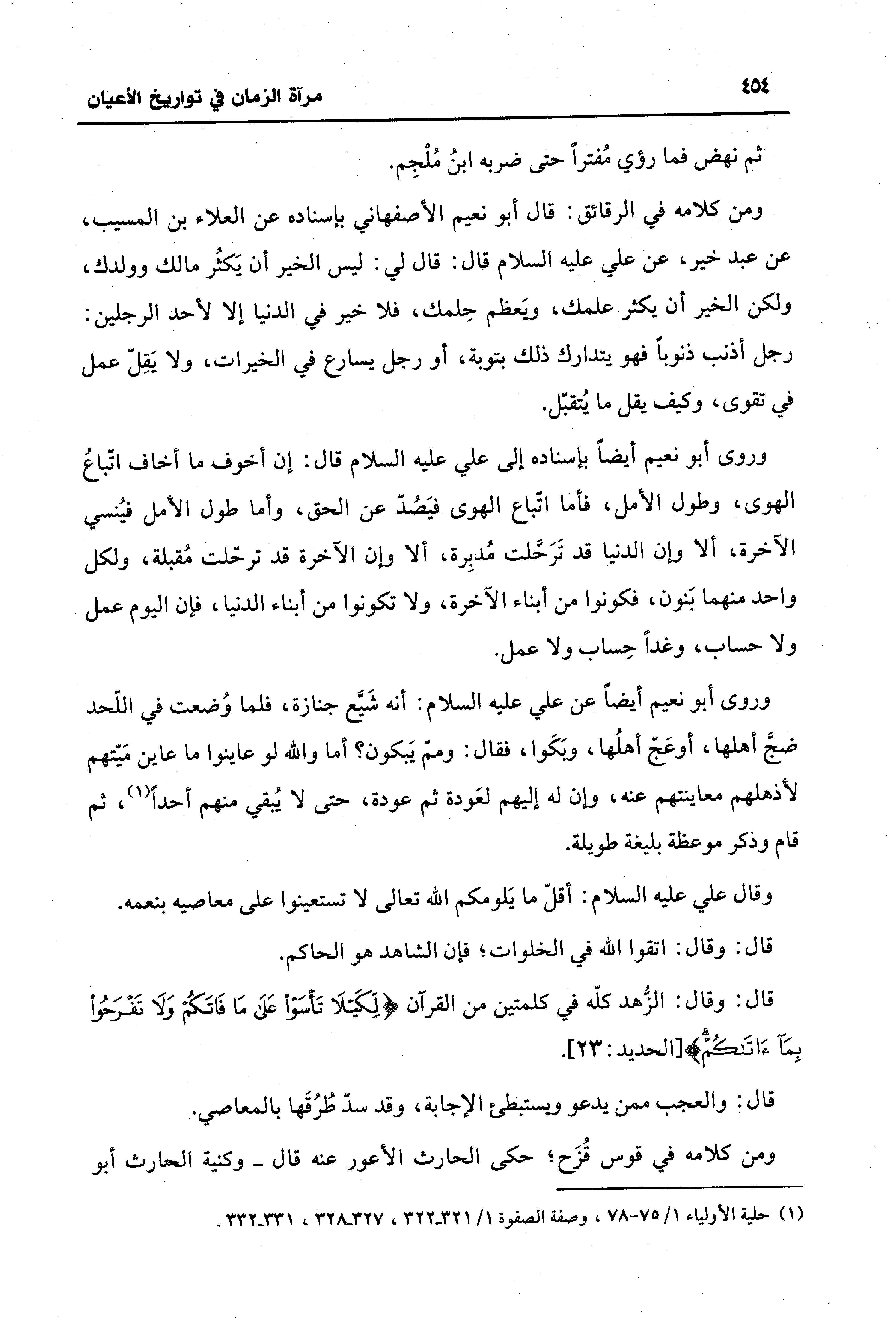 وروى أبو نعيم أيضًا بإسناده إلى علي - عليه السلام - قال: إن أخوف ما أخاف اتّباعُ الهوى، وطول الأمل، فأما اتّباع الهوى فيَصُدّ عن الحق، وأما طول الأمل فيُنسي الآخرة، ألا وإن الدنيا قد تَرَحَّلت مُدبِرة، ألا وإن الآخرة قد ترحّلت مُقبلة، ولكل واحد منهما بَنون، فكونوا من أبناء الآخرة، ولا تكونوا من أبناء الدنيا، فإن اليوم عمل ولا حساب، وغدًا حِساب ولا عمل.