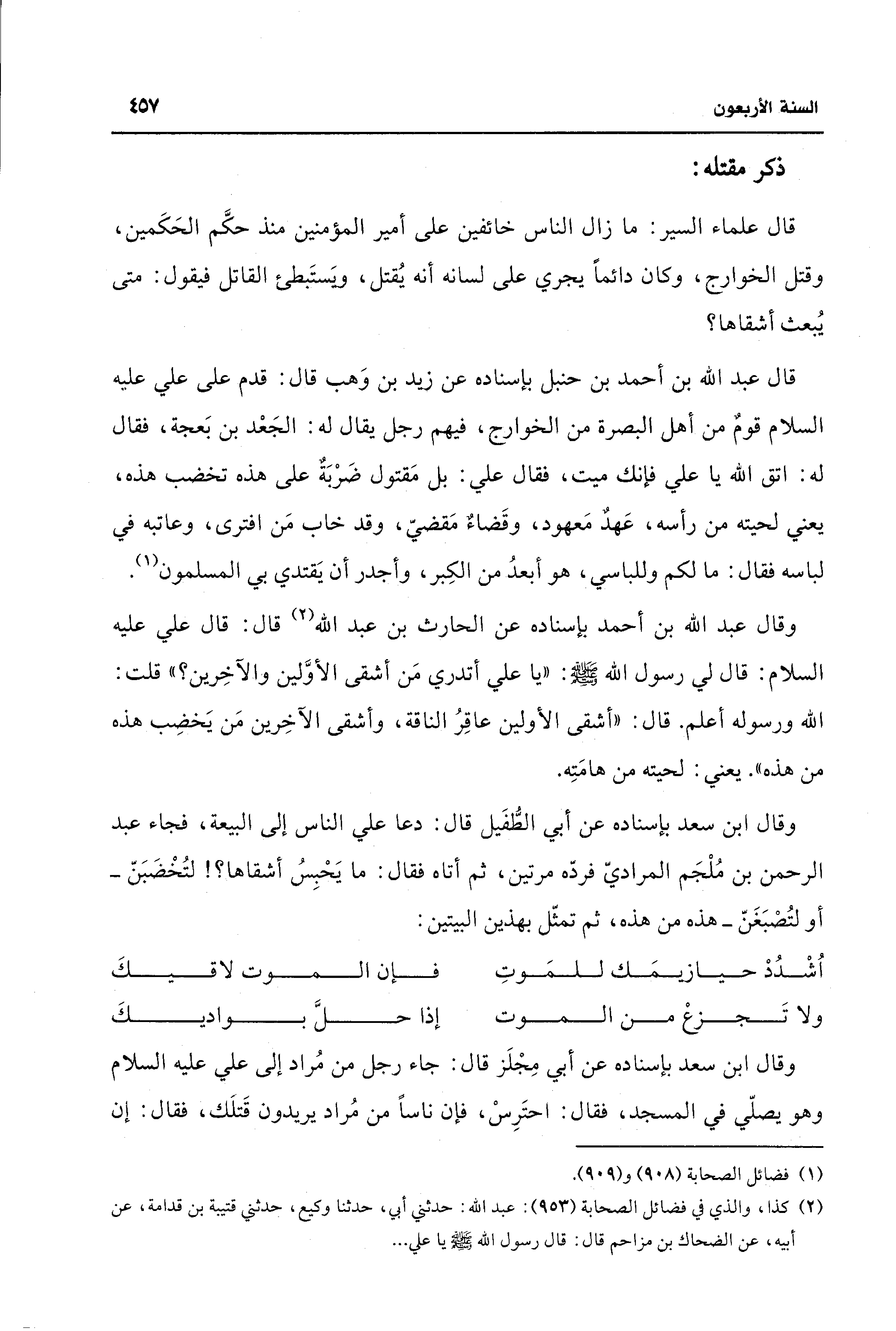 وقال ابن سعد بإسناده عن أبي الطُّفَيل قال: دعا علي الناس إلى البيعة، فجاء عبد الرحمن بن مُلْجَم المراديّ فردّه مرتين، ثم أتاه فقال: ما يَحْبِسُ أشقاها؟ ! لتُخْضَبَنّ -أو لتُضْبَغَنّ- هذه من هذه، ثم تمثّل بهذين البيتين: